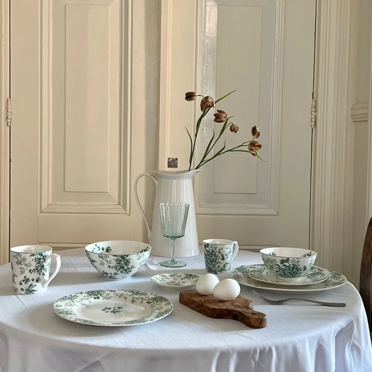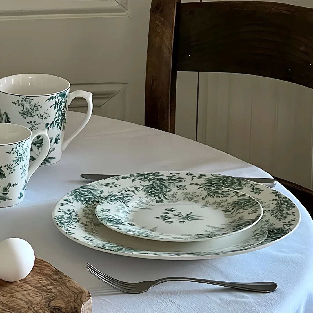 - Platos de porcelana blanca con estampado floral en tonos verdes.