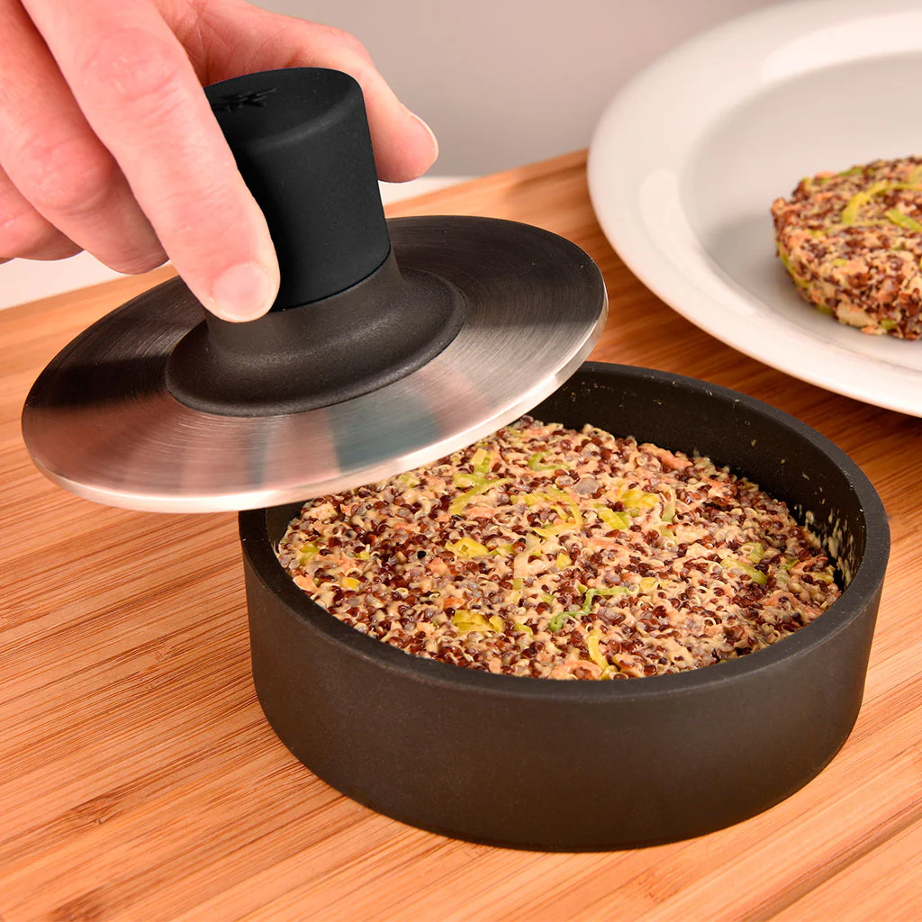La Prensa para hamburguesas BBQ de WMF es un set de molde y prensador, ideal para dar forma a tus hamburguesas caseras con un acabado profesional. De manera muy sencilla y con los ingredientes que tú elijas, tendrás listas unas hamburguesas perfectamente prensadas, que resultarán estupendas cocinadas en la barbacoa, la parrilla o en la sartén.