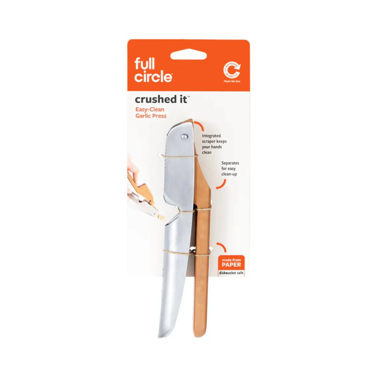 El mango del prensador está hecho con papel kraft reforzado y es muy resistente. Las asas se abren por completo y permiten una limpieza sencilla tanto en el fregadero como en el lavavajillas. La parte del mango que incluye el raspador es de acero inoxidable y permite eliminar el ajo prensado y los restos con total comodidad. ¿A qué esperas para hacerte con este prensador para ajos de acero inoxidable Crushed It Full Circle?