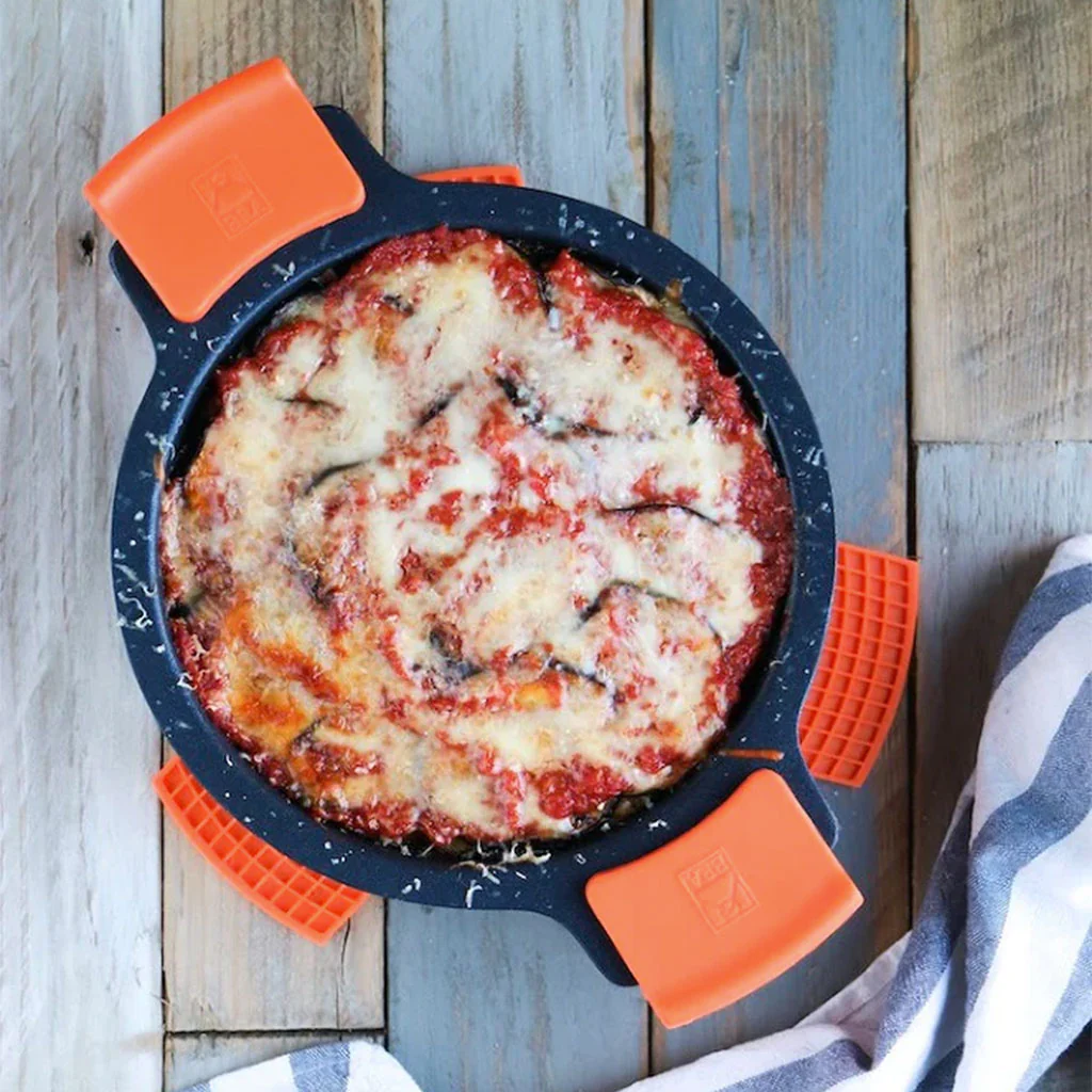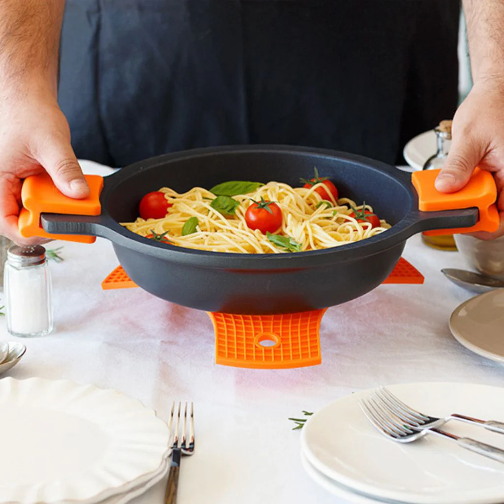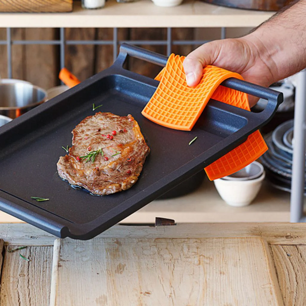 Coloca cada protector entre dos sartenes para protegerlas de arañazos y mantenerlas siempre protegidas. O como agarrador para sujetar los mangos de tus sartenes de hierro, o ayudarte a sacar del horno la cocotte, la fuente de los macarrones o la bandeja de hornear las galletas, sin miedo a quemarte ni a que se queme, ya que resisten hasta los 250 °C.