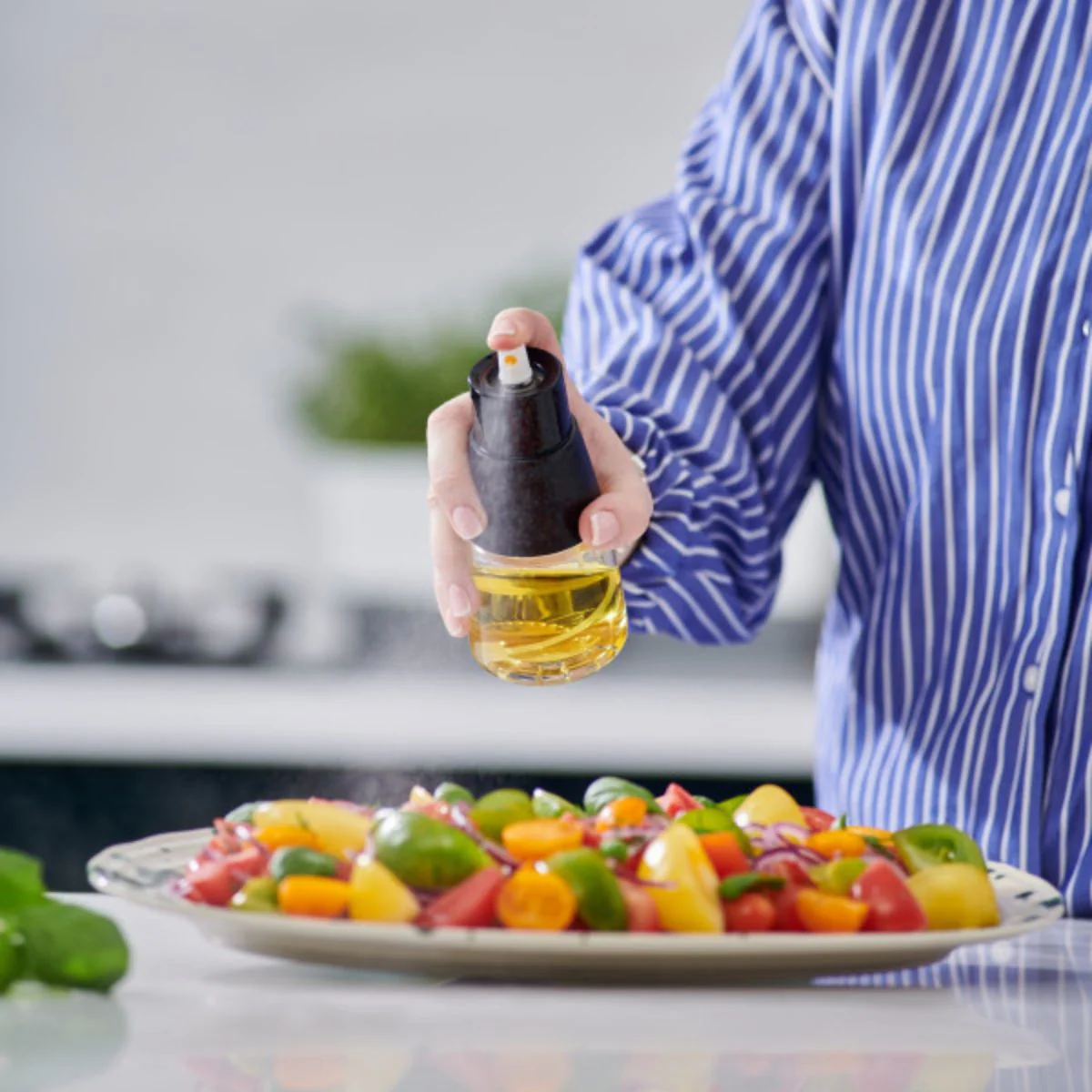 El uso de este pulverizador es muy cómodo y sencillo, puesto que tan solo debes bombear la tapa para cargar y apretar el pulsador del spray. ¡Así de simple! Funciona perfectamente con todo tipo de aceites y vinagres, incluso los más densos, y también para el vinagre o las vinagretas caseras. Tiene la gran ventaja de que te permite controlar y repartir la cantidad de aceite que quieres emplear al cocinar o al aliñar la comida.