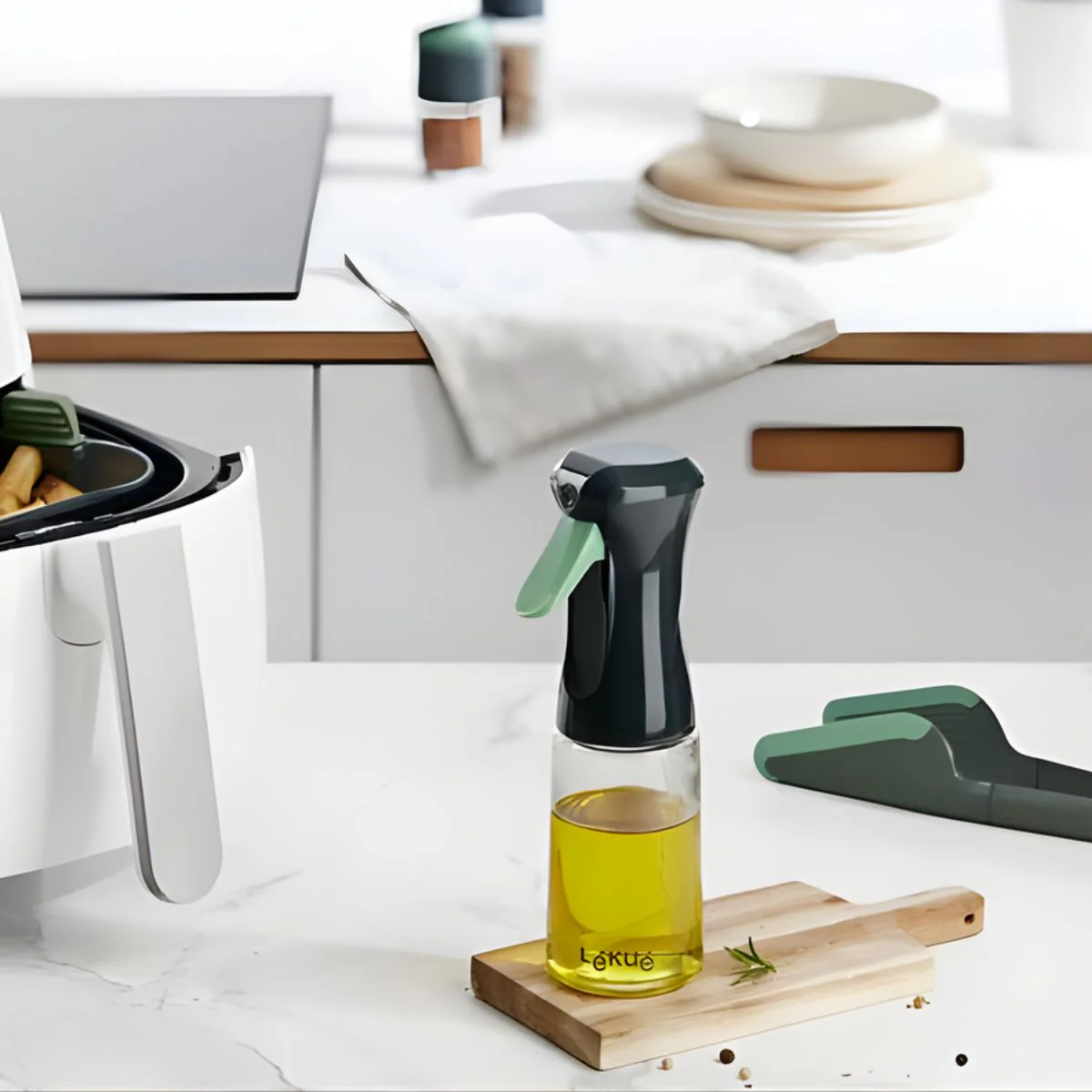 Fabricado en vidrio de borosilicato, el Pulverizador de aceite Lékué es ideal para aliñar tus platos y engrasar moldes y sartenes de forma fácil, eficiente y limpia. Su práctico mecanismo de gatillo ayuda a manejarlo con una sola mano de forma muy cómoda. Gracias a su sistema de pulverización fina en abanico es perfecto para preparar los utensilios y alimentos, resultando un gran ayudante para saltear, hornear o cocinar en tu freidora de aire, aplicando la cantidad justa de aceite, sin excesos.