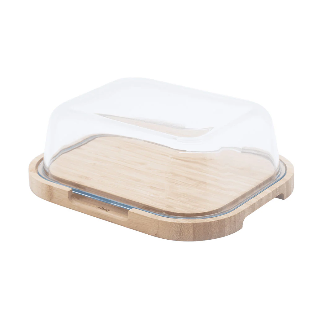 - Quesera Pebbly de vidrio y base de bambú natural.