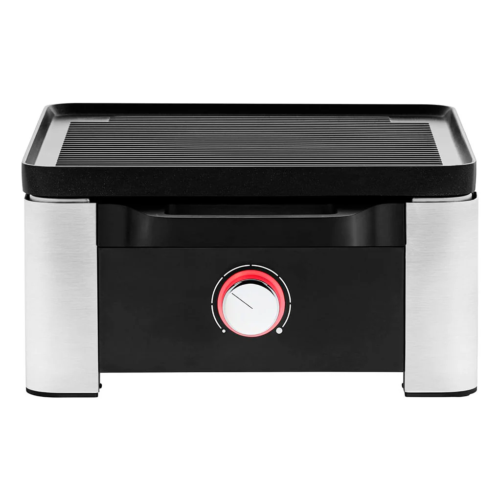 Dispone de termostato regulable con iluminación LED, para que puedas subir o bajar la temperatura según necesites. La placa tiene una superficie de 23 x 25 cm, es extraíble y apta para el lavavajillas, aunque es recomendable lavarla a mano. Además, en su diseño incorpora un estante inferior, ideal para dejar las sartenes calientes sin usar, manteniendo siempre la mesa o el mantel protegido.
