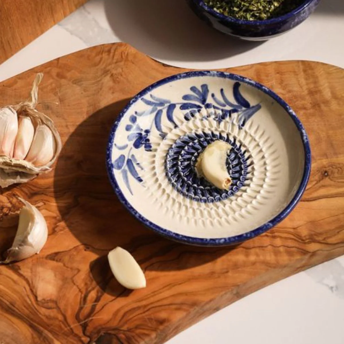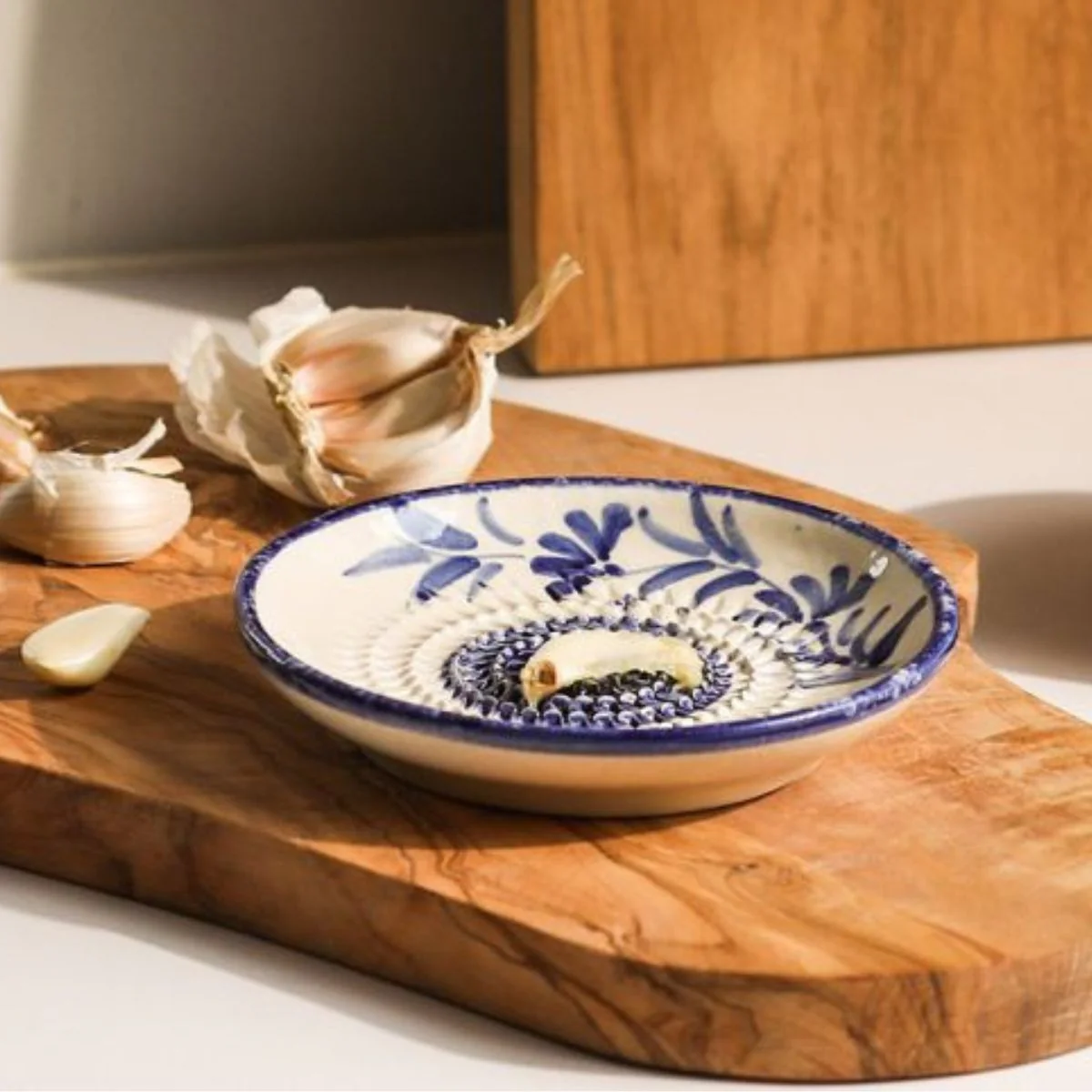 Fabricado artesanalmente en España y pintado a mano con maestría, el Rallador cerámico de ajo Selbrae es un encantador plato con relieve que no puede faltar en tu cocina. Con su precioso diseño y sus delicados estampados en tonos azules y blancos, en cualquiera de sus dos diseños aportará un elegante toque mediterráneo. Tan bonito como funcional, la superficie afilada de este rallador es perfecta para rallar ajos, jengibre, nuez moscada, cardamomo, manzanas, zanahorias o rábanos.