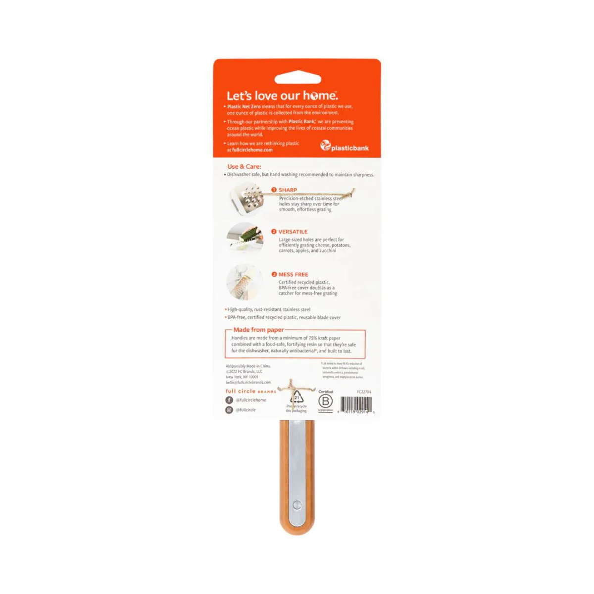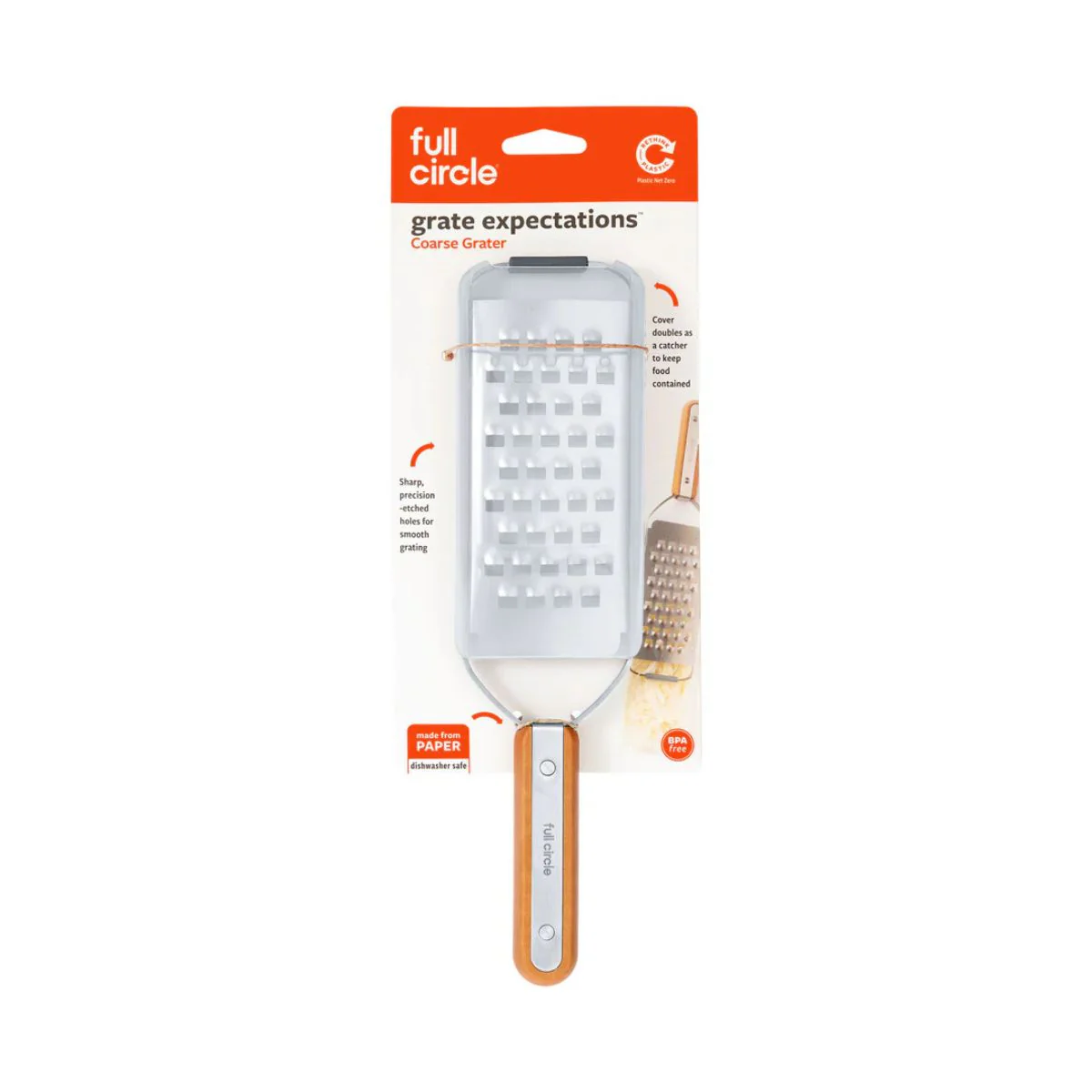 Utilizar este rallador con recogedor Grate Expectations Full Circle es de lo más cómodo. Gracias al mango fabricado con papel kraft duradero, es muy agradable al tacto y permite un agarre firme. El recogedor está fabricado con plástico reciclado certificado, libre de BPA, y permite rallar sin ensuciar y al mismo tiempo, aprovechar todo lo que se ha rallado.