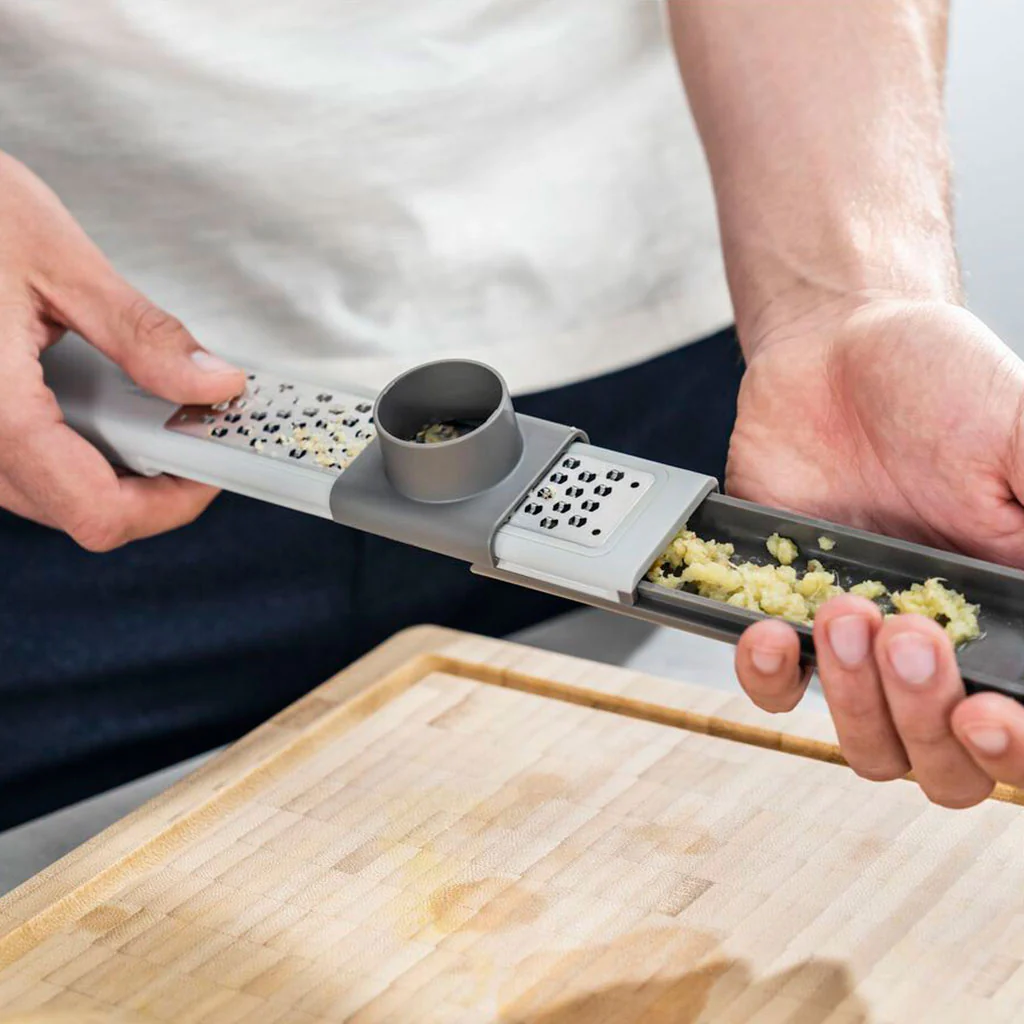 • Su cuchilla de rallado de trama fina es extremadamente afilada. Con solo deslizar el alimento, permite rallar fácilmente la piel de naranjas, limones o limas, raspando la superficie como si la acariciase, sin llegar a la parte blanca. Es ideal también para rallar finamente alimentos como el jengibre, los ajos, todo tipo de frutos secos, quesos duros o el chocolate.