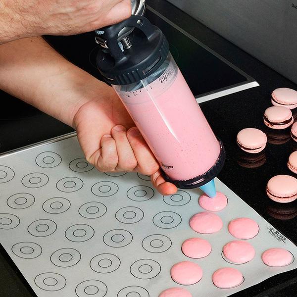 Con la pistola y las recargas, podrás rellenar, adornar y decorar fácilmente todo tipo de recetas, además de poder dosificar con la cantidad deseada y hacer mil y una formas y galletas con la pistola a presión De Buyer.