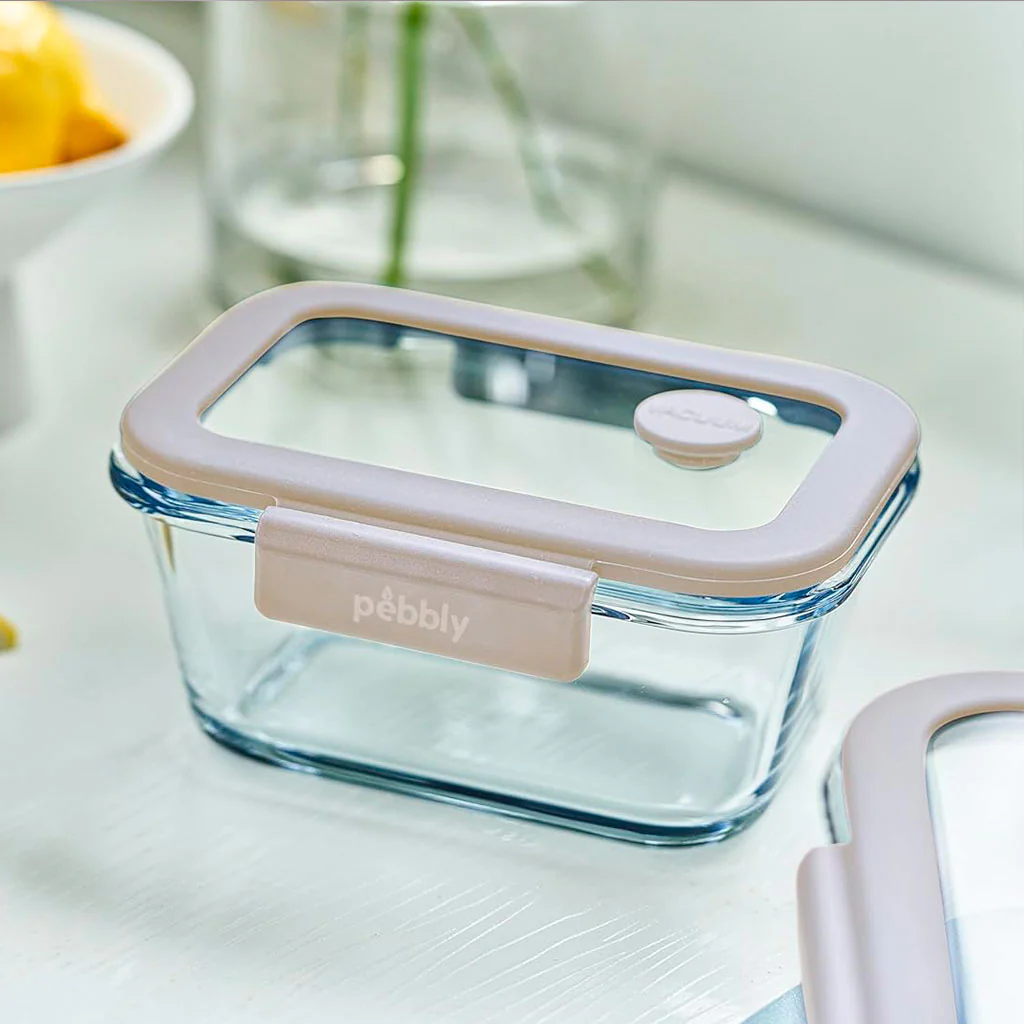 Cada Recipiente de cristal para vacío Pebbly es una estupenda solución para la conservación al vacío de tus alimentos frescos o las recetas que hayas preparado en tuppers de vidrio, material sano y que no absorbe olores ni sabores. Los recipientes y las tapas son de cristal, totalmente libres de BPA. La junta de silicona de la tapa cuenta con dos solapas laterales de clip, que aseguran el cierre hermético y totalmente estanco. Al ser transparentes, podrás ver el todo momento el interior sin tener que abrir la tapa.