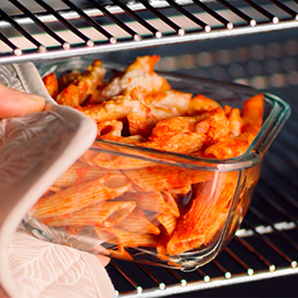 - Aptos para el horno sin la junta de silicona. Máximo 220 °C. Introducir en el horno sin calentar previamente para evitar los contrastes térmicos.