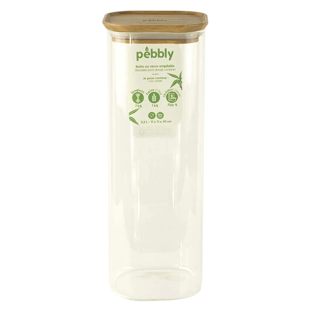 Los Recipientes altos de cristal con tapa de bambú de Pebbly son unos botes apilables, ideales para conservar en perfectas condiciones alimentos secos como legumbres, harina, pasta o arroz. Su tapa de bambú, además de ser resistente a la humedad, te asegura un cierre hermético gracias a su junta de silicona.