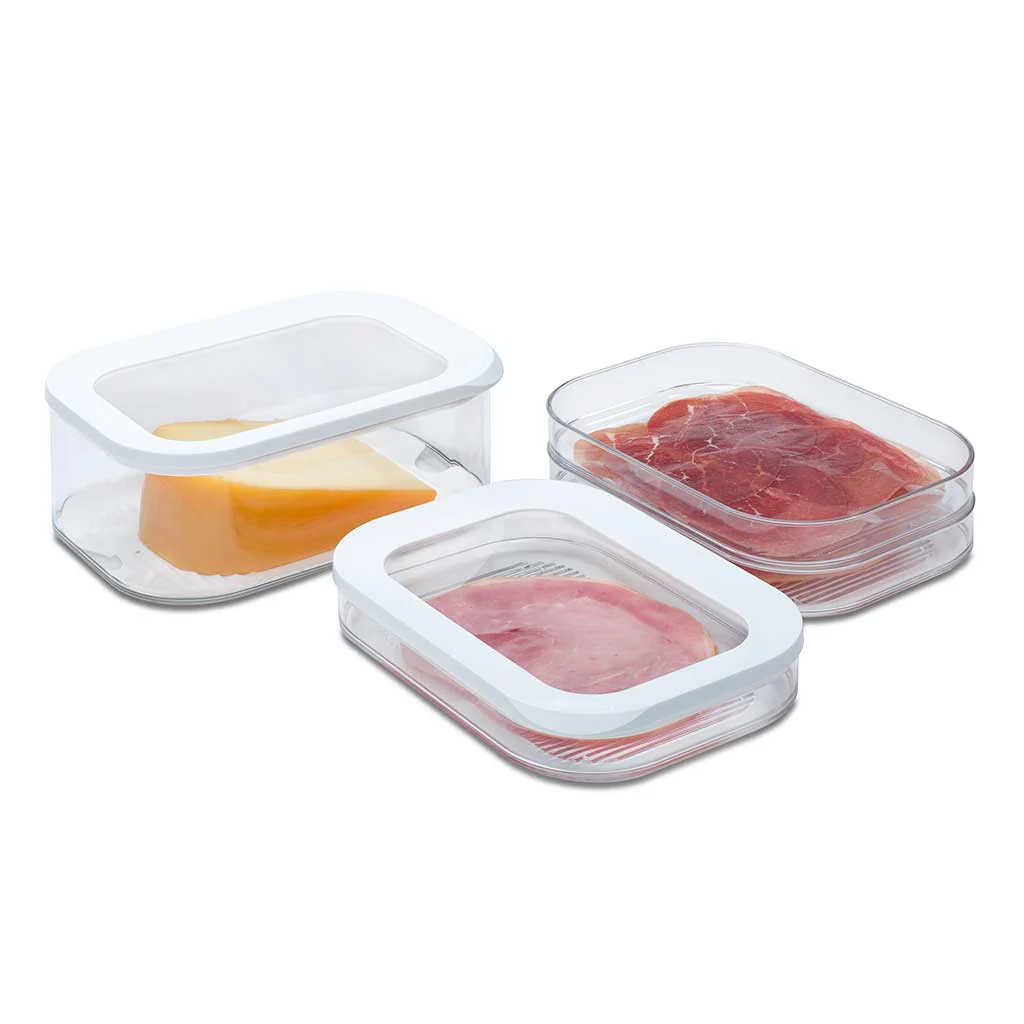 Fáciles de abrir, de cerrar y de limpiar, además son apilables, por lo que tendrás todos tus embutidos, quesos y fiambres ordenados, organizados y siempre a la vista. Su base estriada ayuda a evitar la humedad prologando su conservación.