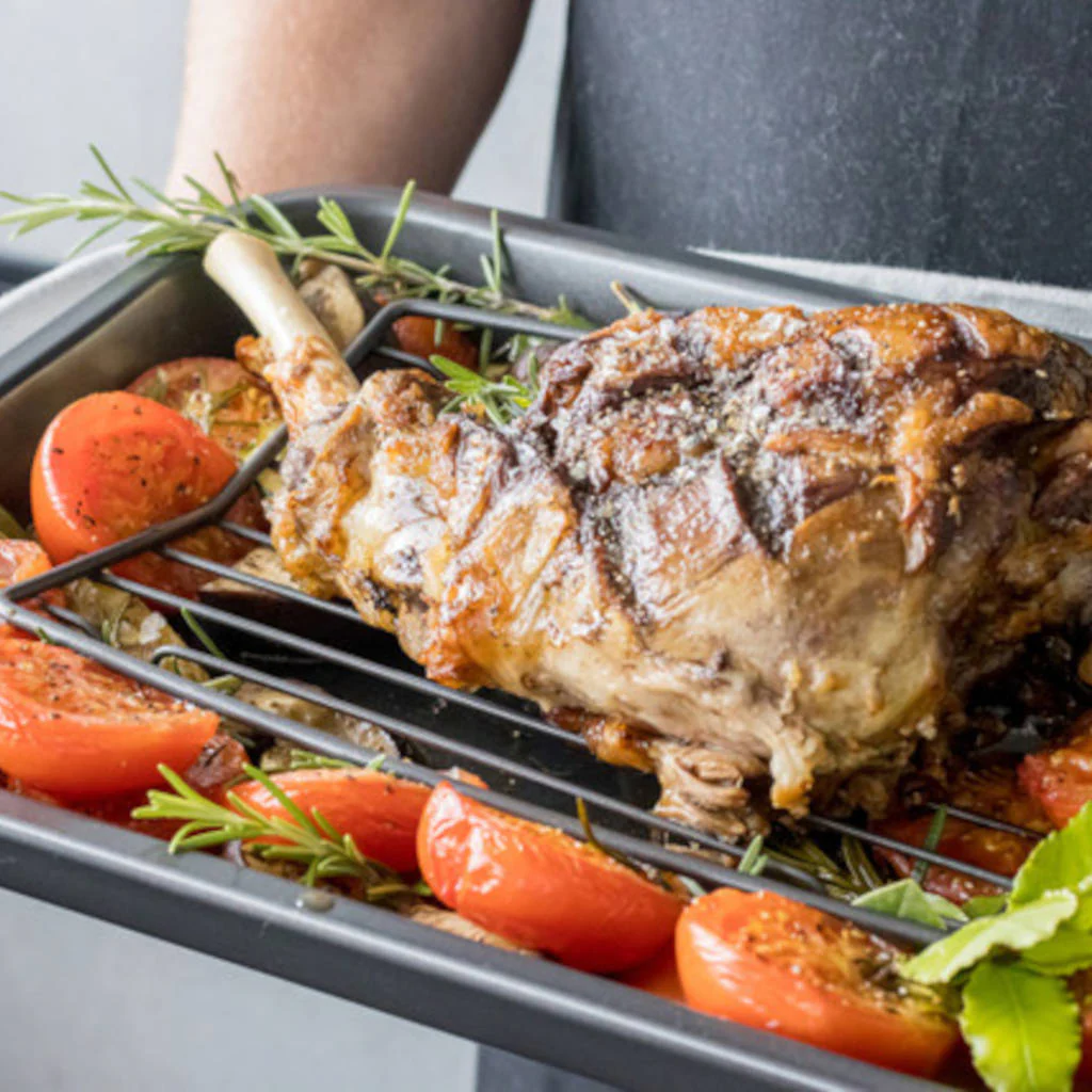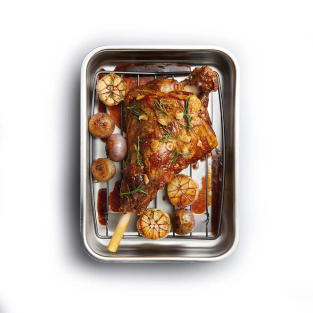 Con unas dimensiones de 26 x 21 cm, esta rejilla es perfecta para una amplia variedad de recetas de asados. Ya sea que estés preparando pollo crujiente con tomillo, un jugoso cordero con ajo y romero, o cualquier otra receta de asado, esta rejilla se adapta a una gran variedad de carnes y recetas.