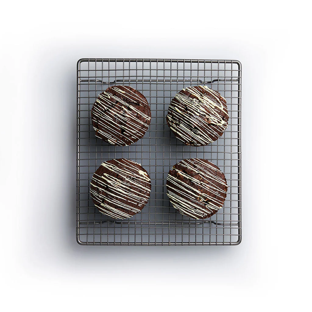 Las 4 patas de apoyo de la rejilla la mantienen ligeramente elevada, permitiendo que circule el aire para que tus tartas y moldes se enfríen rápidamente. Y colocada sobre una fuente o una bandeja, es perfecta para glasear tus plumcakes y bizcochos con total comodidad.