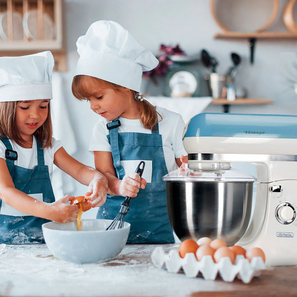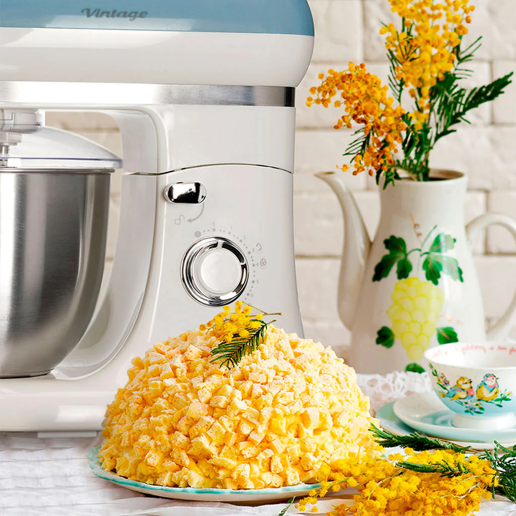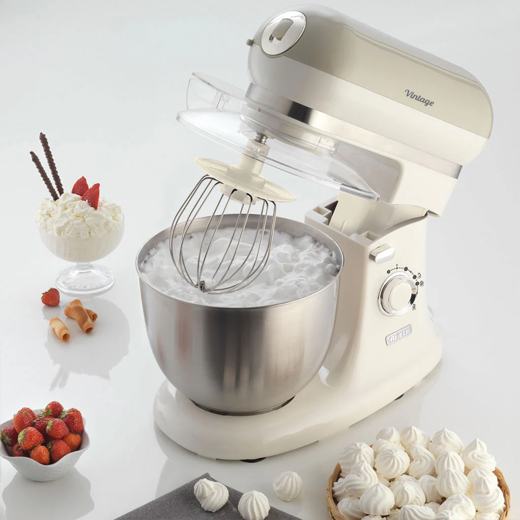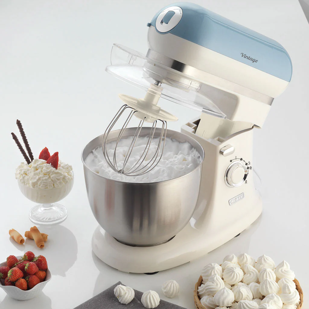 Con un encantador diseño de aire retro, el Robot de cocina Vintage Ariete te va a enamorar. Tan bonito como funcional, podrás mezclar, batir y amasar deliciosas preparaciones de forma fácil, limpia y cómoda. Esta batidora amasadora cuenta con un bol de acero inoxidable de 5,5 litros de capacidad. Sus 7 velocidades te permitirán adaptar el nivel a lo que cada elaboración necesite. Además, incluye 3 batidores y tapa antisalpicaduras, para que puedas añadir los ingredientes sin tener que parar el robot. Robusto, funcional y con un diseño precioso, es perfecto para cualquier cocina.
