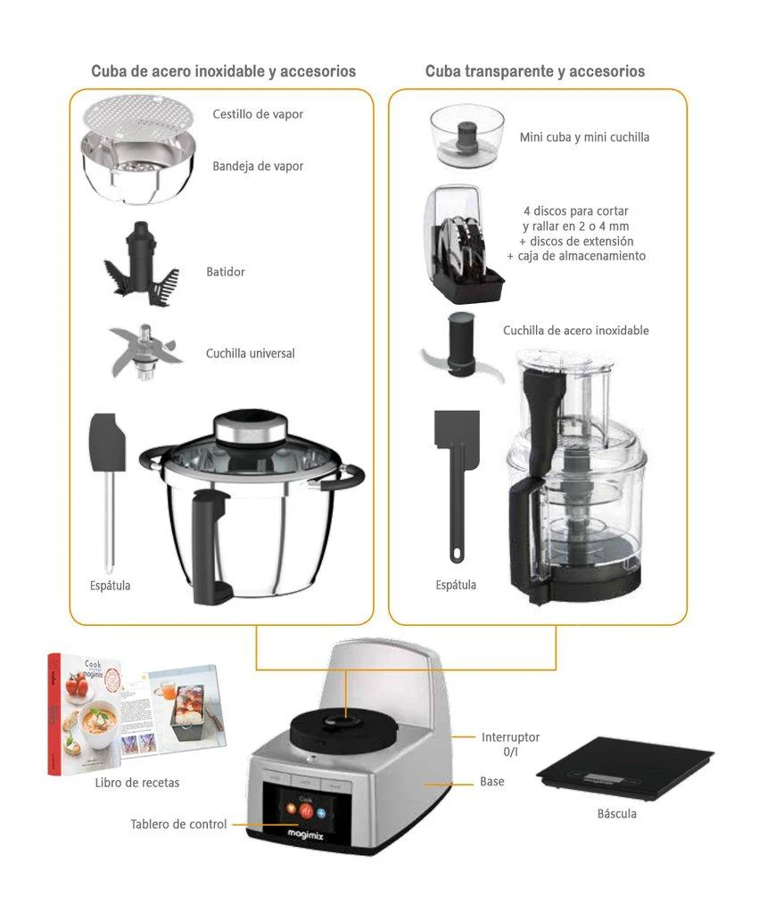 Magimix Cook Expert viene equipado con todo lo que necesitas para usarlo como procesador de alimentos y como robot de cocina multifunción. Porqué hay una cosa importante que debes saber de Magimix Cook Expert: a diferencia de otros robots multifunción, aparte de incluir el bol de acero para todo tipo de preparaciones de mezcla, batido y cocción, también incluye tres boles que se adaptan a la máquina para procesar los alimentos con la ayuda de sus cuchillas especiales.