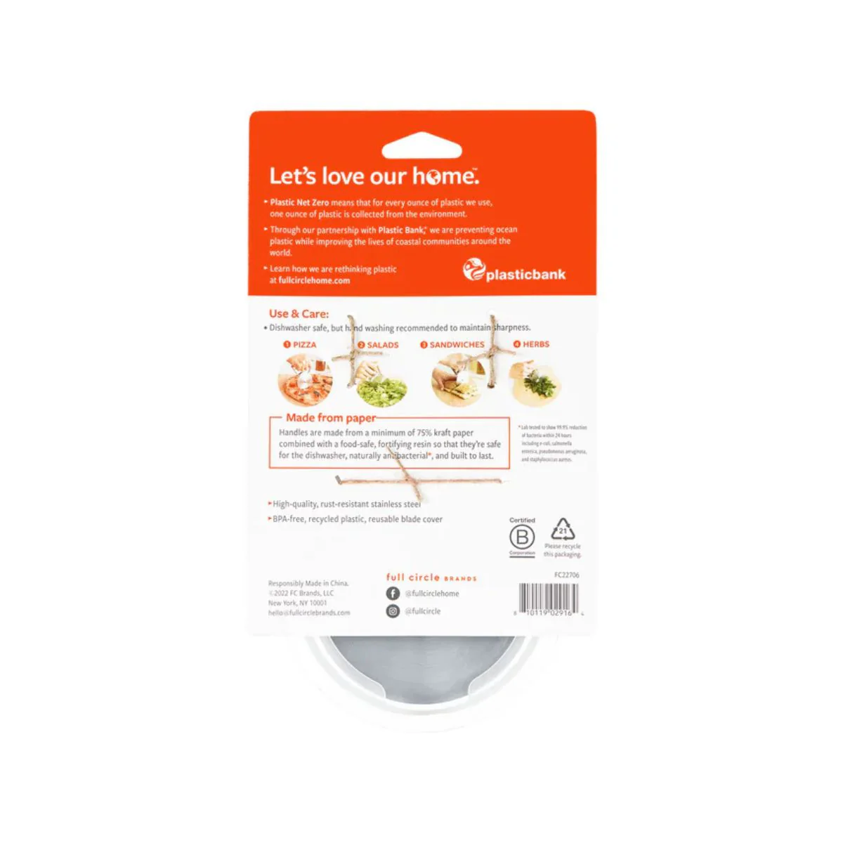 La rueda está fabricada en acero inoxidable y el mango es de papel kraft reforzado. El uso de estos materiales hacen de la rueda cortapizzas de acero inoxidable Full Circle un utensilio de lo más resistente, duradero e incluso apto para el lavavajillas. ¡Ay!, que casi se nos olvida: viene con una cubierta de seguridad reutilizable de plástico reciclado para que puedas guardarla en los cajones.