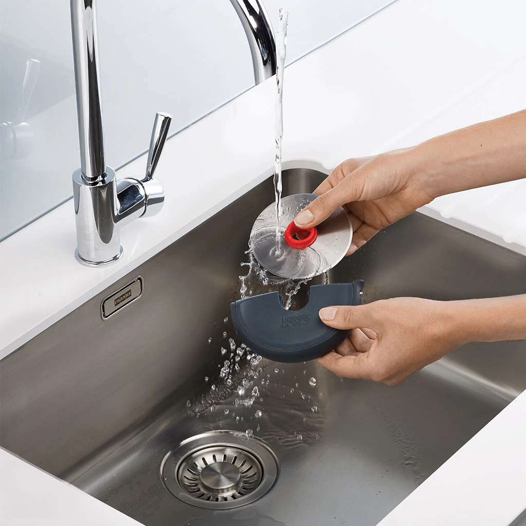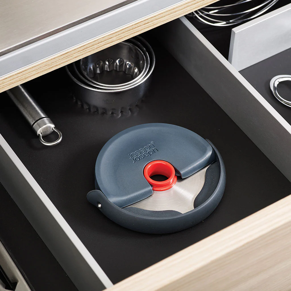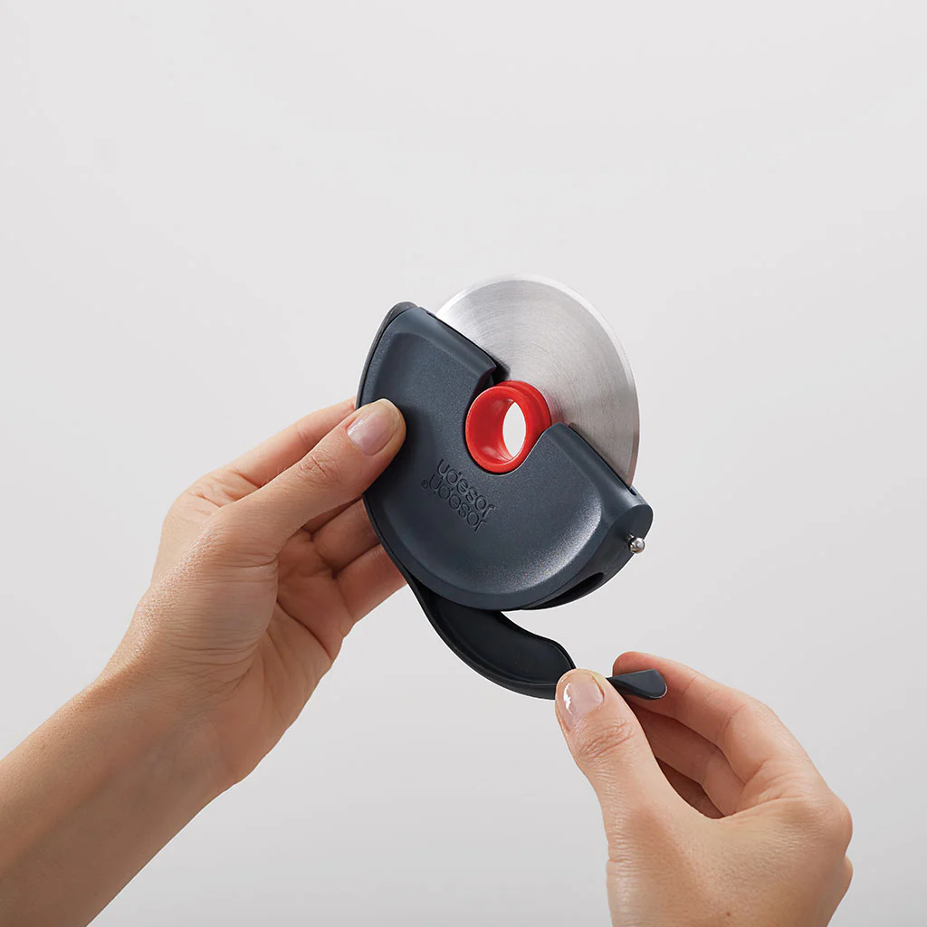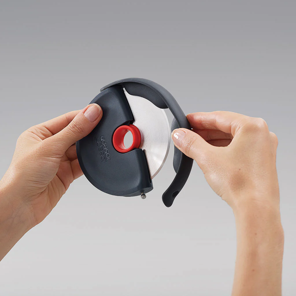 La Rueda cortapizzas Disc Joseph Joseph es un cortador de pizzas de lo más eficaz. Este utensilio de cocina, ideal para cortar la pizza, las tartas saladas y dulces, o la focaccia, cuenta con una cuchilla de acero inoxidable con forma de disco circular, que te facilitará el corte. El protector de hoja es de silicona y es reversible, para colocarlo sobre la funda y crear un agarre ergonómico antideslizante que quedará sujeto a la mano, para una total seguridad.