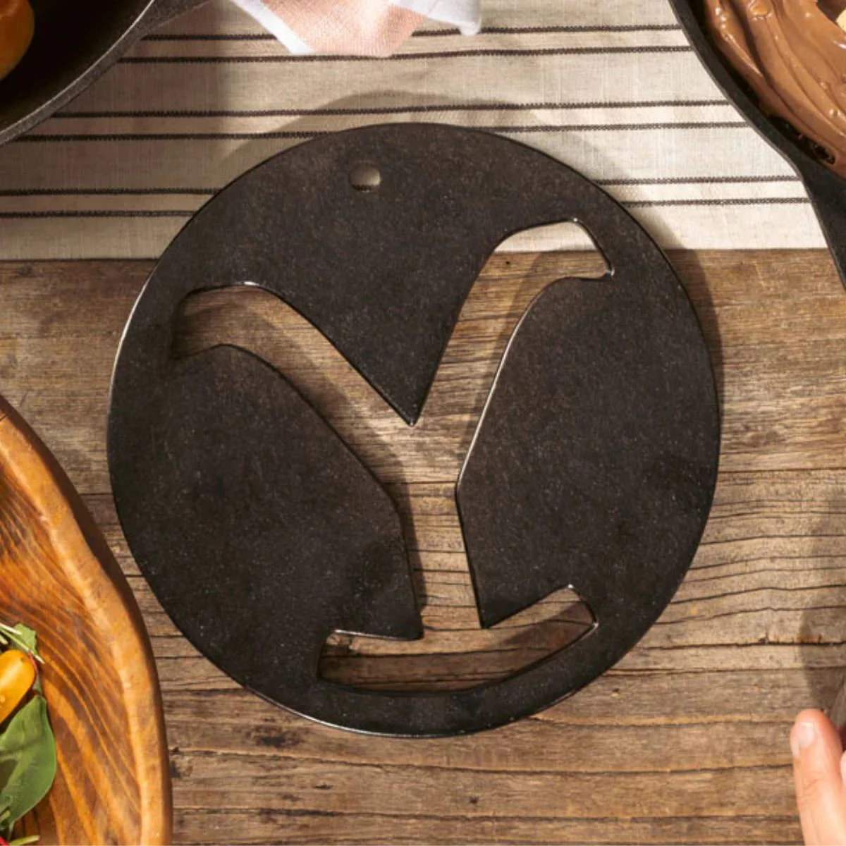 Fabricado en hierro fundido y con un diámetro de 20,32 cm, es funcional, sobrio, duradero y resistente. Su estructura sólida garantiza una gran resistencia al calor, definiéndose así como un soporte seguro para cualquier tipo de recipiente caliente. Este salvamanteles de colección protegerá como nadie las superficies del calor de las sartenes, cacerolas, cocottes o bandejas recién salidas del horno
