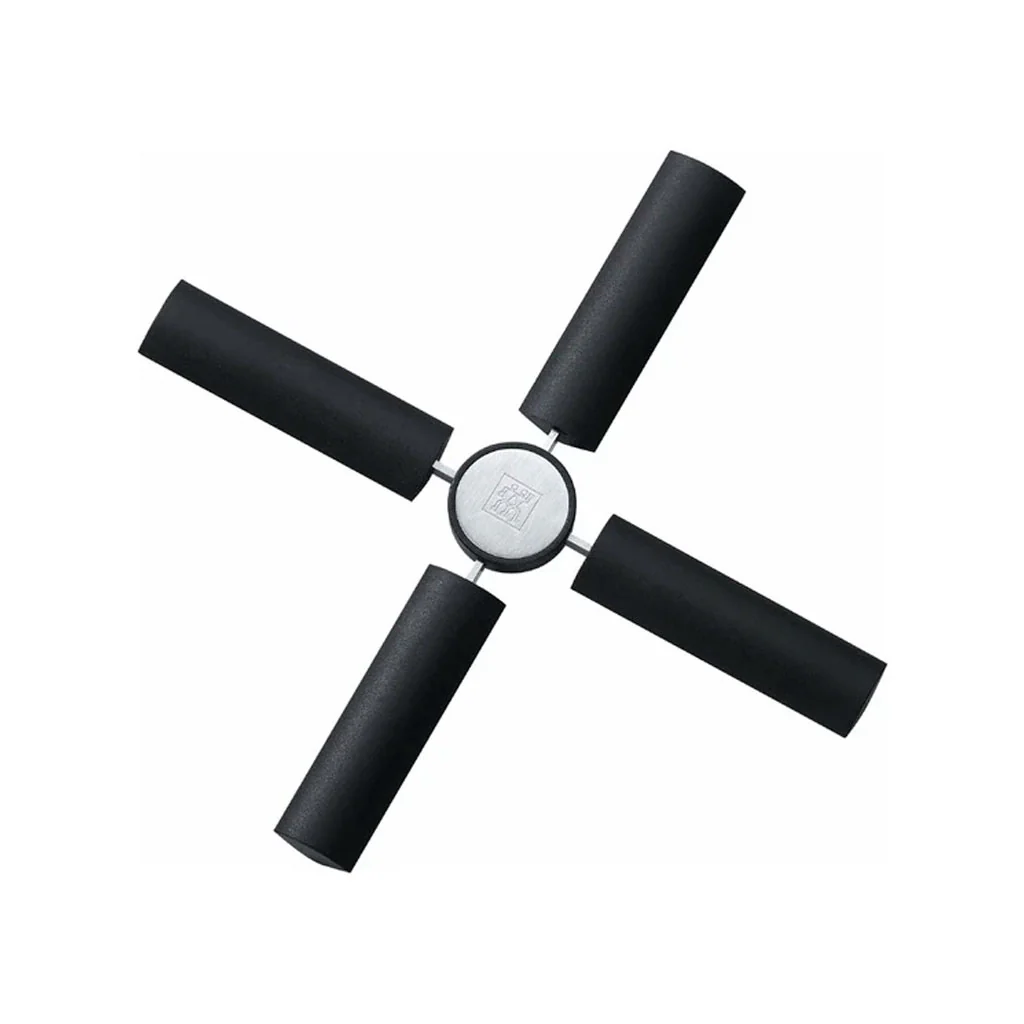 El salvamanteles Twing ofrece un diseño elegante y atemporal, y está fabricado con interior de acero y 4 patas plegables recubiertas de silicona negra, agradable al tacto y antideslizantes, para un reposo seguro del menaje que dispongas en él.