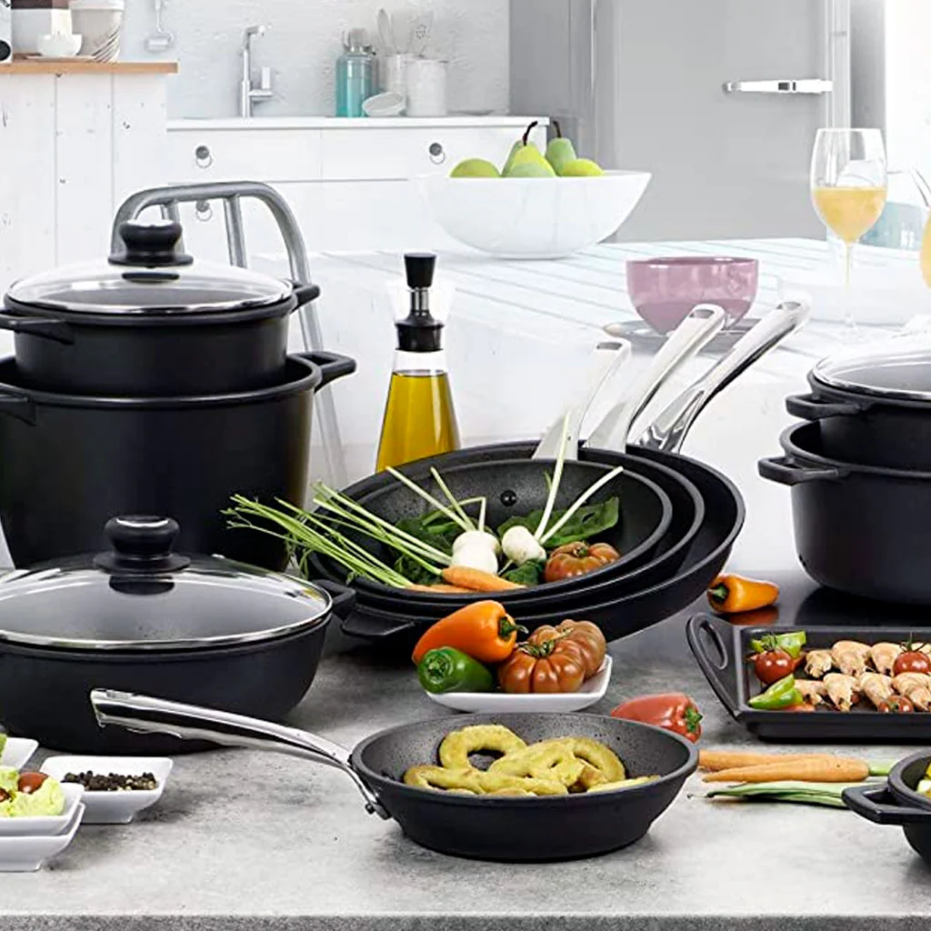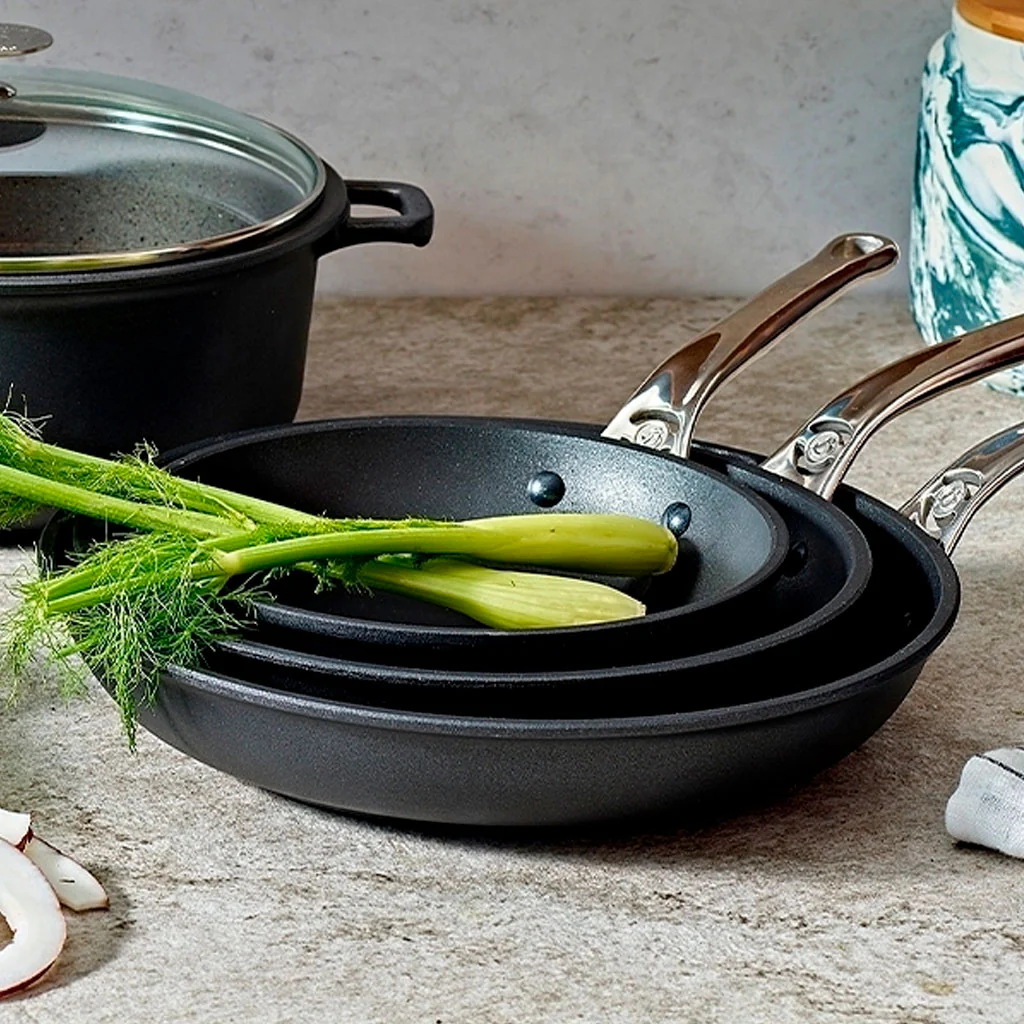 Es una sartén que, por su estructura (gracias al grosor del aluminio fundido), proporciona una cocción uniforme y controlada en toda la superficie, así que tendrás un control perfecto de la temperatura y tus recetas; todo ello mientras no se pega nada, gracias a la calidad de su antiadherente.