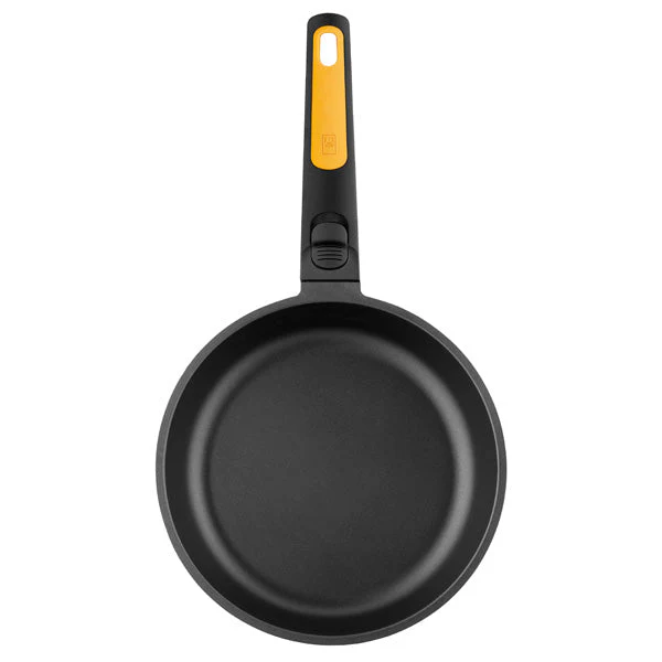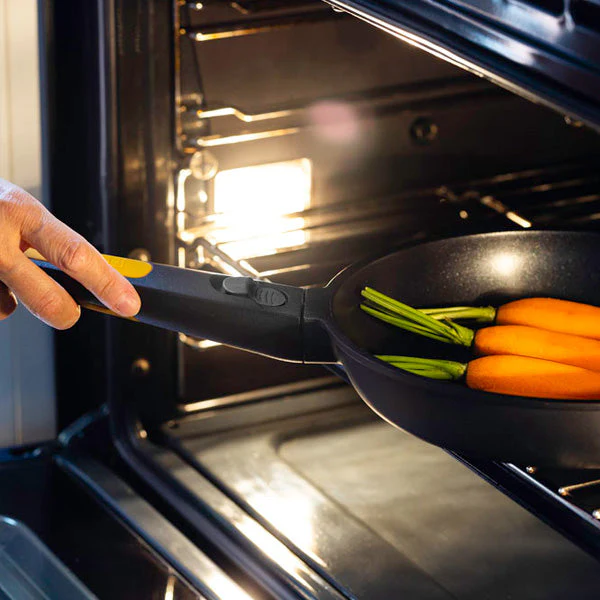 Con la sartén antiadherente con mango desmontable Fast Click de BRA son todo ventajas. Lo de hacer un tetris para guardar las sartenes en el cajón intentando que quepan unas dentro de otras sin que los mangos lo impidan pasará a la historia. Con esta sartén y su mango desmontable, puedes quitarlo de manera muy sencilla para guardarla cómodamente.