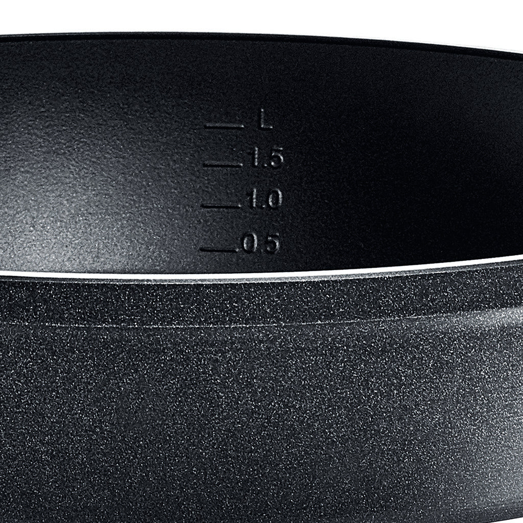 - Dispone de escala medidora integrada en relieve, que es ideal para medir correctamente cantidades de líquidos y también para controlar las reducciones de salsas.