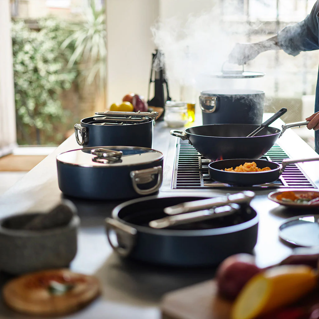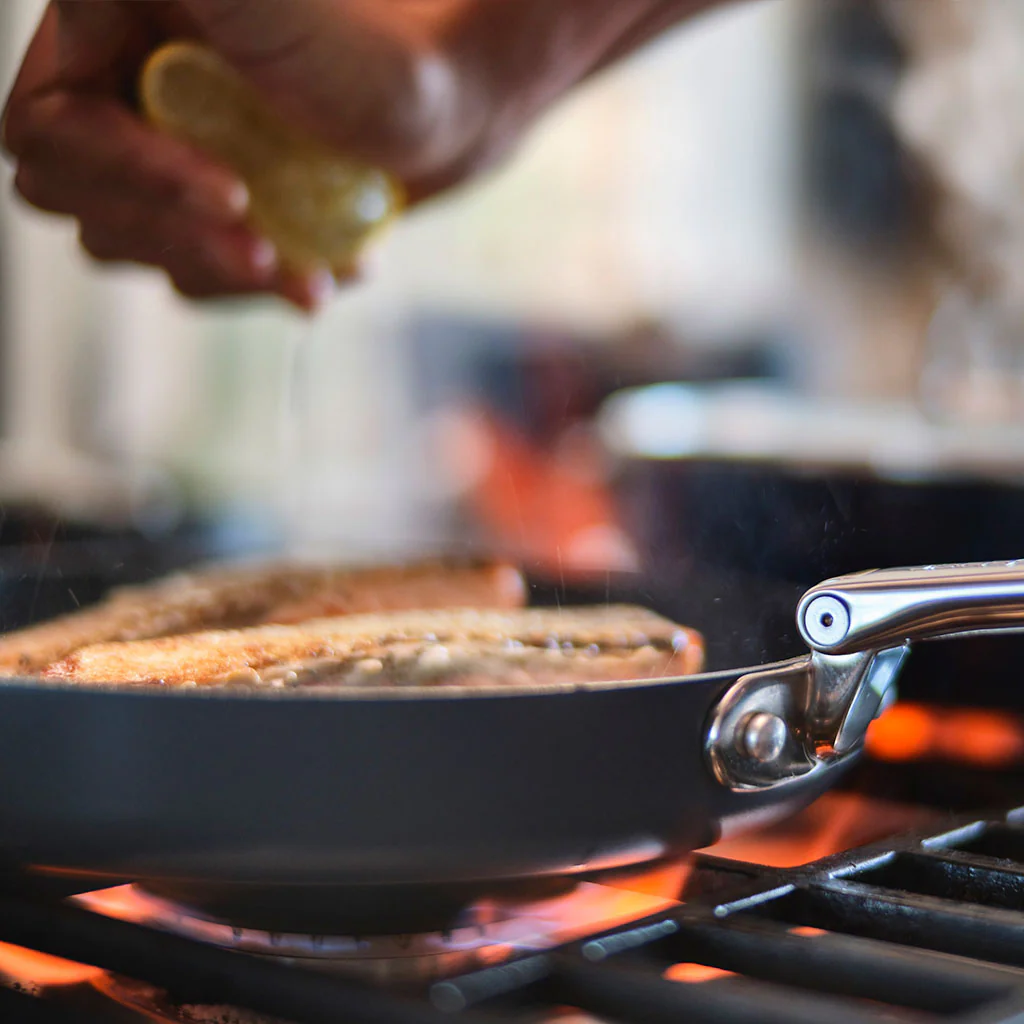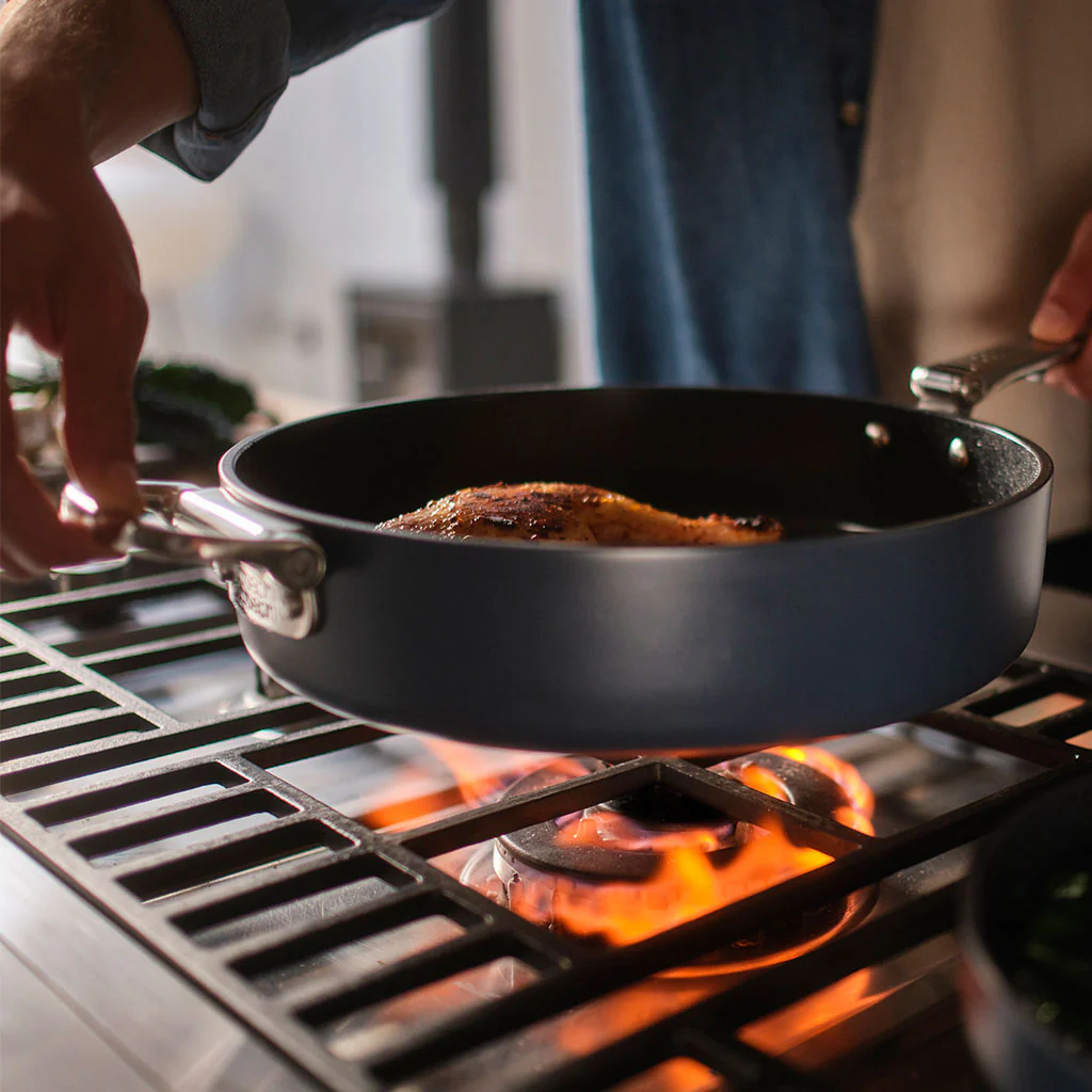 - Sus paredes altas y rectas, que proporcionan una gran versatilidad. Además de ser una sartén ideal para freír, saltear, dorar o marcar cualquier alimento, este diseño de sauté hace de ella una cacerola baja estupenda, perfecta para preparar todo tipo de guisos caldosos, estofados o platos de pasta.