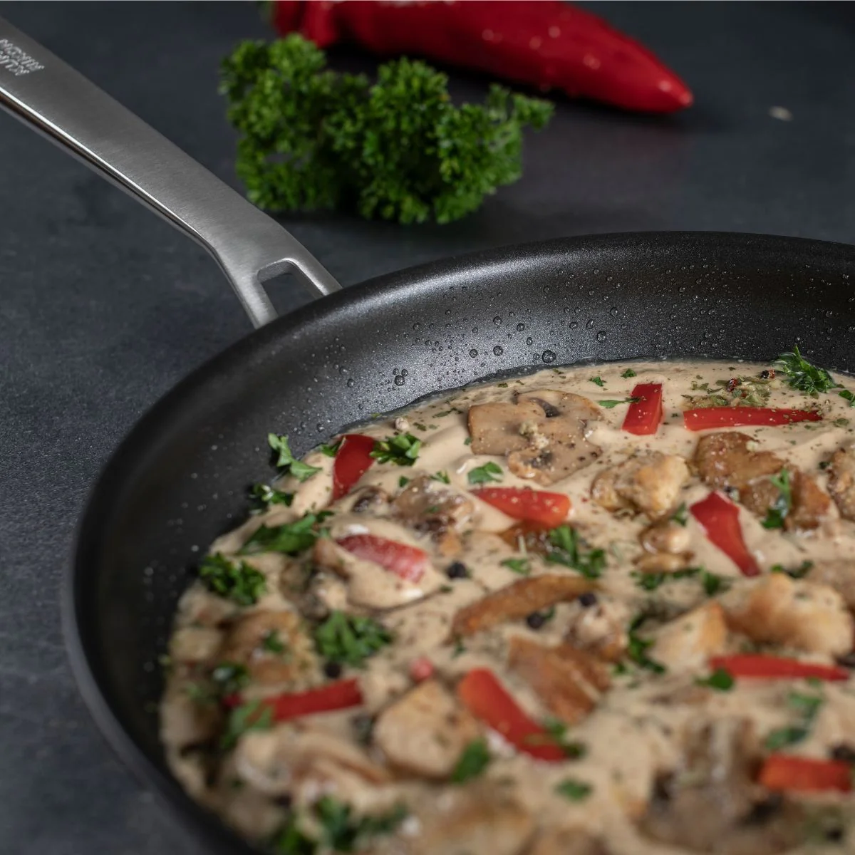- Borde cerrado. El borde de la sartén, sin cantos afilados, facilita el vertido de salsas y jugos, reduciendo el riesgo de quemaduras y garantizando que además de un resultado perfecto, la presentación de tus platos también lo sea.