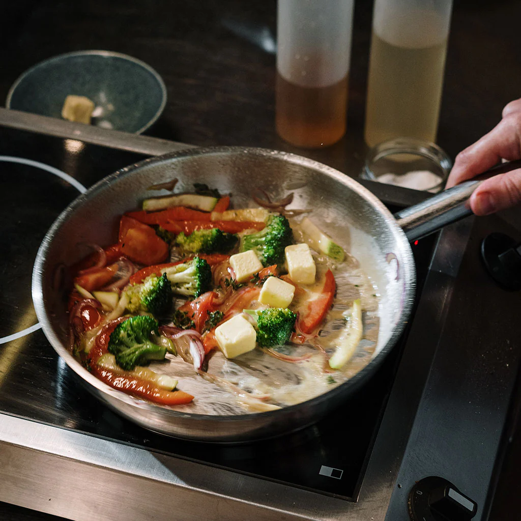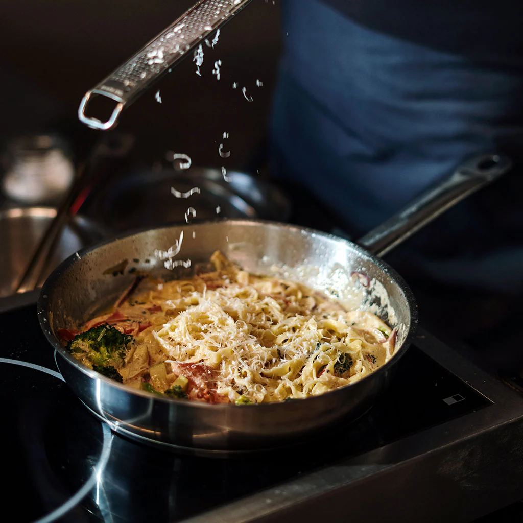 Una sartén de acero inoxidable 18/10 con acabado satinado y base difusora del calor, apta para todas las cocinas, incluida la inducción.
