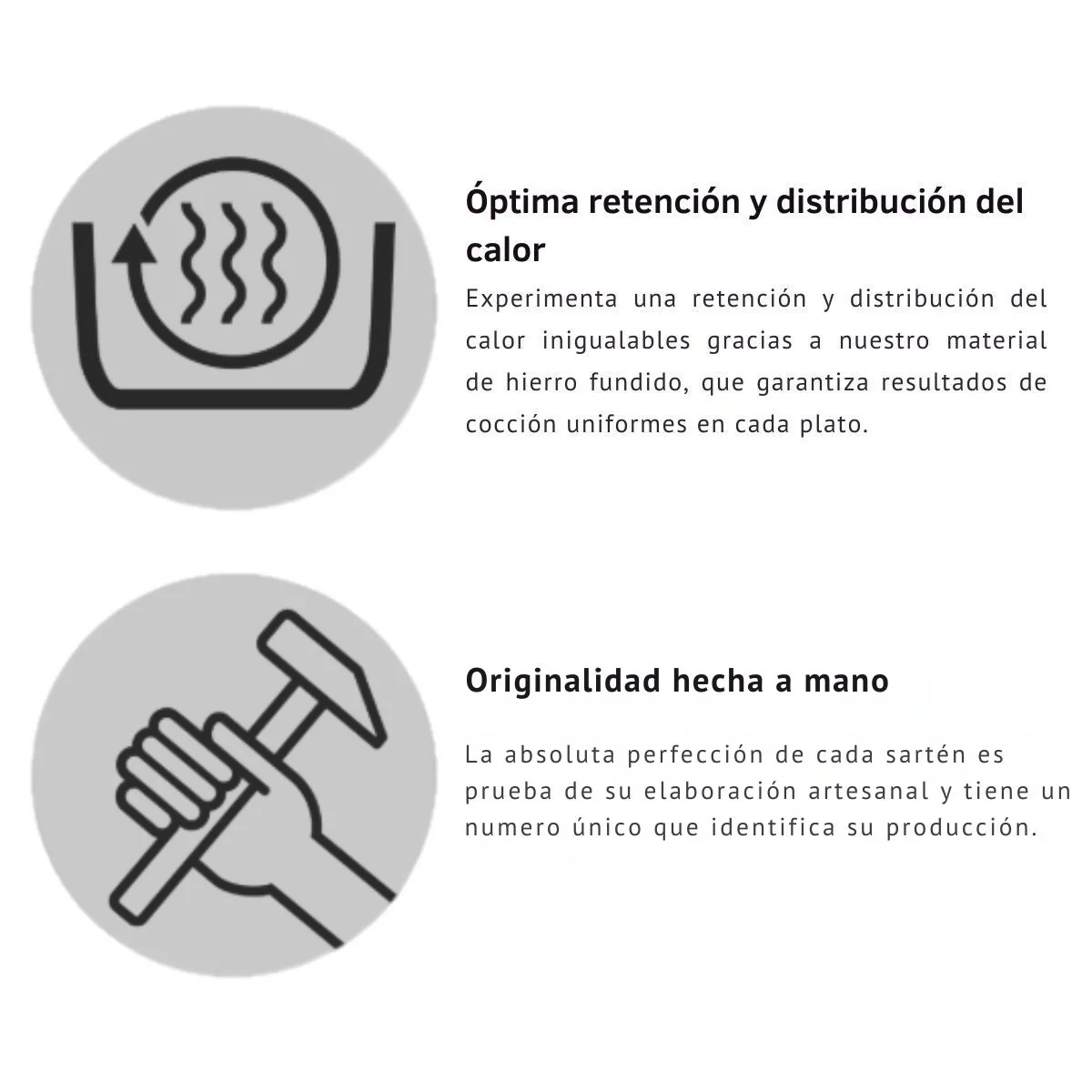 - Su mango y asa de sujeción. Con un diámetro de 28 cm y siendo una pieza de hierro fundido, no es una sartén ligera, por lo que el asa de agarre facilita su manejo y lo hace más seguro. El mango y el asa son de hierro fundido, por lo que se calientan al cocinar, tanto en el fuego como en el horno. Deben usarse guantes de cocina o agarradores cuando la lleves de los fogones al horno o a la mesa.