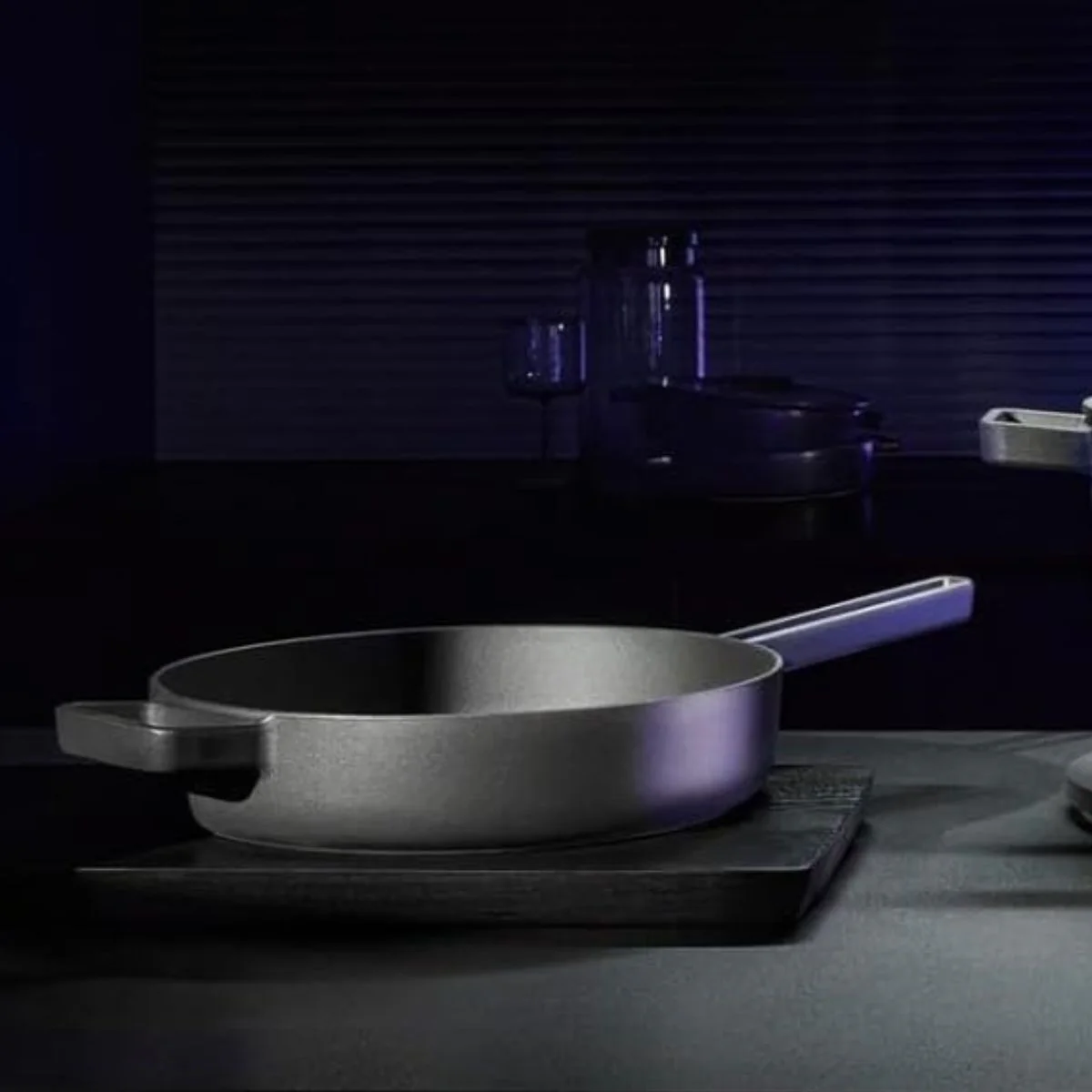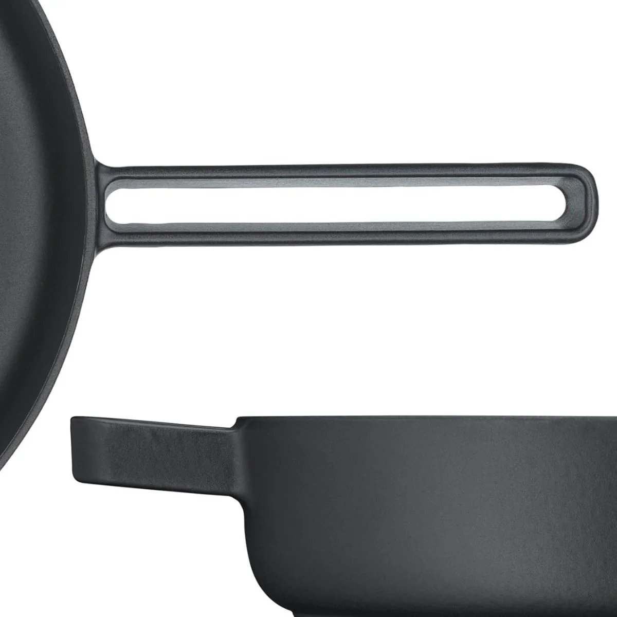 - Sartén tipo sauté de hierro fundido esmaltado en color negro mate.