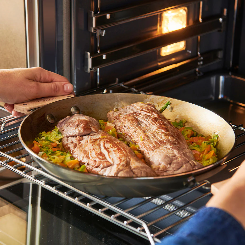 La sartén Mineral B es perfecta para freír, saltear, o marcar cualquier pieza de carne. La gran retención del calor del hierro garantiza el sellado de los alimentos, conservando sus jugos y todo su sabor. ¡No hay nada más natural que cocinar en sartenes de hierro! Además, la funcionalidad añadida de poder intercambiar asas y mango, permite tener también una paellera, ideal para tus arroces o para cocinar en el horno platos deliciosos.