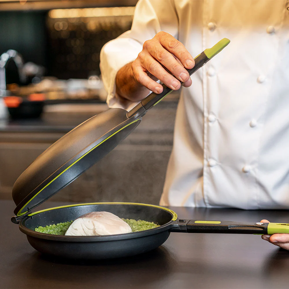 ¿Estás cansado de que preparar una tortilla en buenas condiciones sea una odisea para ti? Con la sartén Doble Foodie de BRA podrás preparar deliciosas tortillas sin ningún tipo de problema, vamos, que podrás darle la vuelta cómodamente sin perder la mitad por el camino. Con esta sartén formada por dos sartenes que se acoplan gracias a unas juntas de color verde que crean un cierre hermético, las tortillas dejarán de tener secretos para ti.