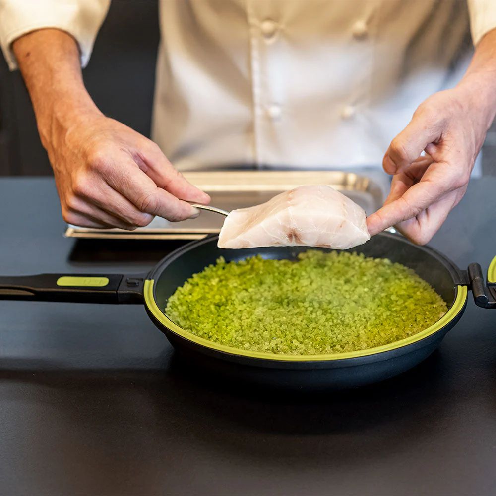 • Permite asar con efecto horno: gracias a su junta aislante y el imán del mango, hace que se cree dentro de la sartén un efecto horno completamente uniforme.