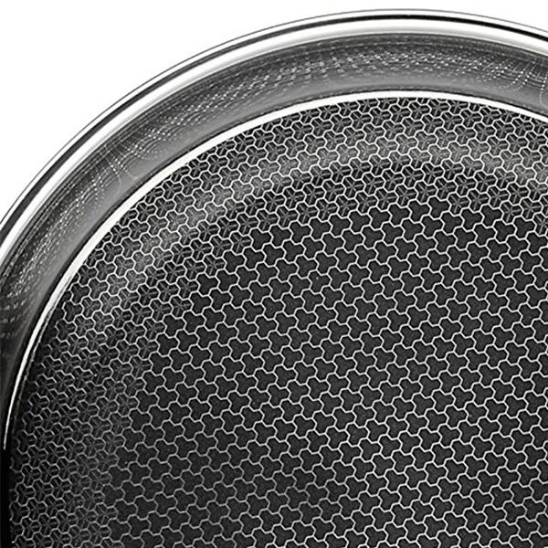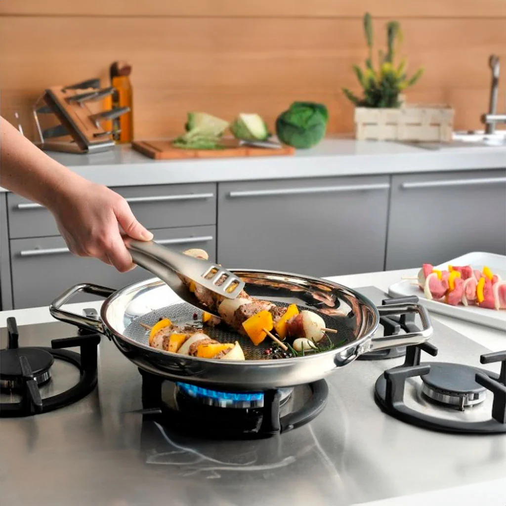 - Es una sartén de mucha calidad fabricada en acero inoxidable para una cocción perfecta y una antiadherente muy resistente gracias a su rejilla de acero inoxidable.