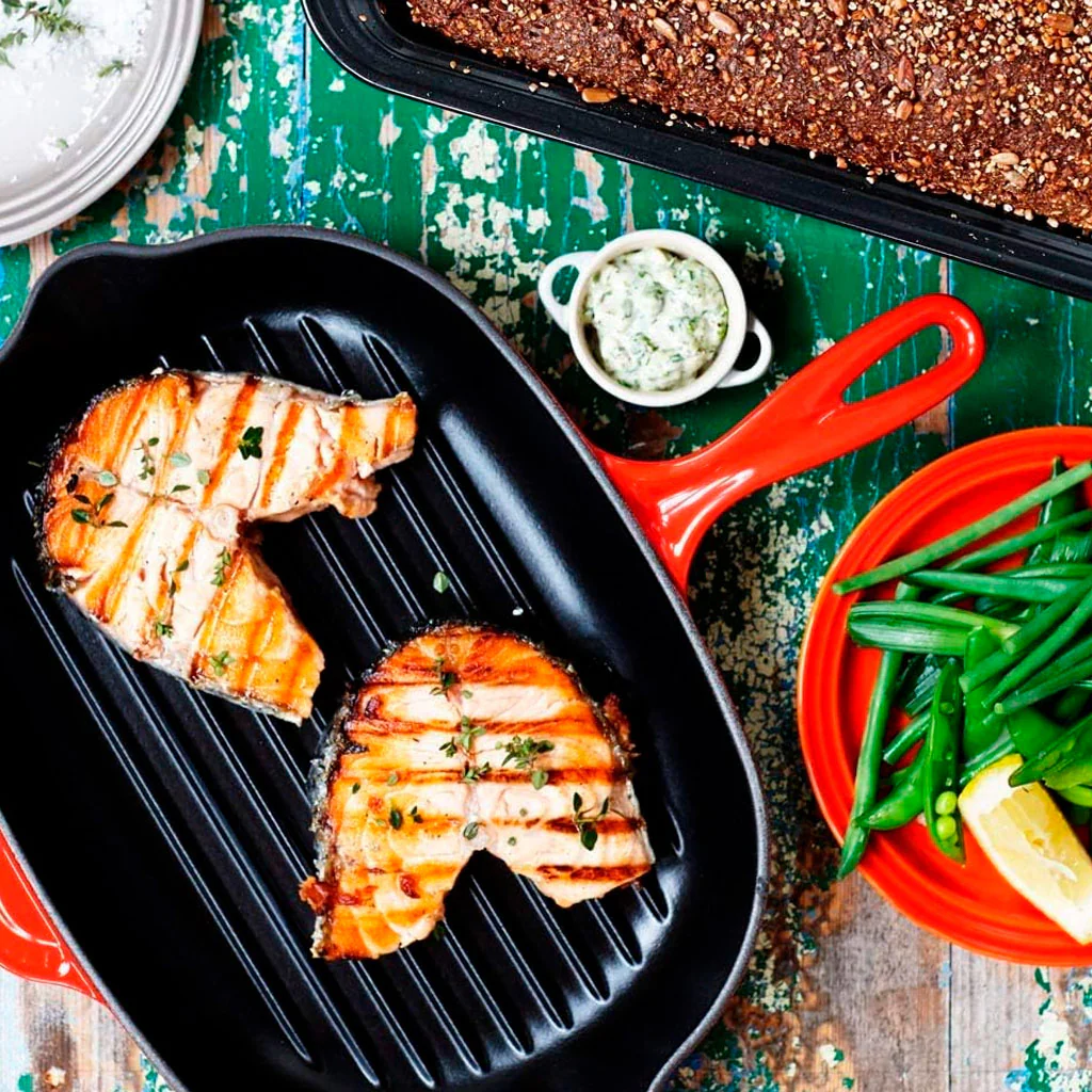 Con la Sartén skillet grill oval Le Creuset vas a cocinar a las mil maravillas, ¡y para toda la familia! Esta parrilla cuenta con una amplia superficie de cocción que te va a permitir sellar generosas raciones o grandes piezas de una sola vez. Carnes, pescados, verduras, y también pizzas, cocas o empanadas, tanto en los fogones, como en el horno o en la barbacoa.