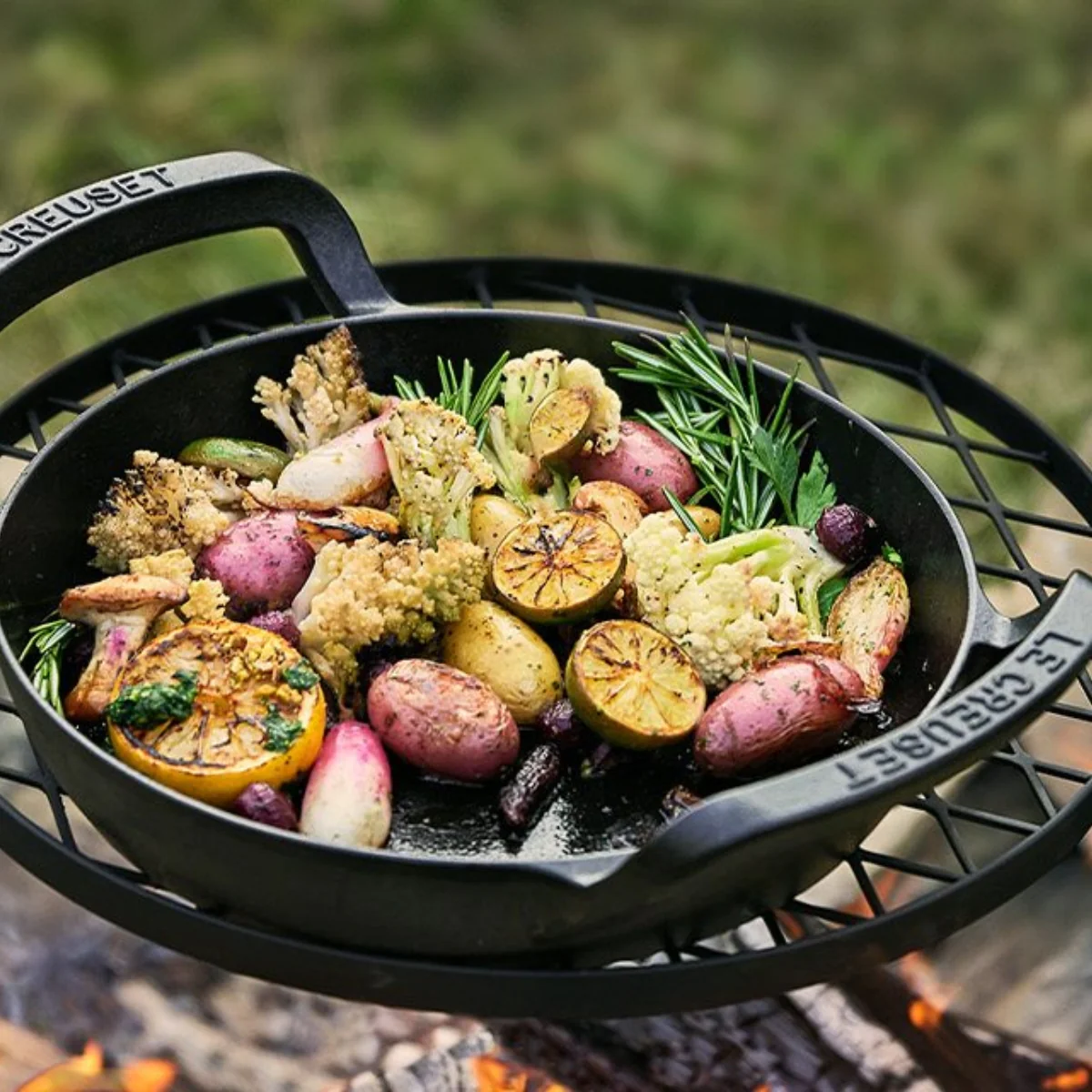 - Forma parte de la primera colección de Le Creuset específicamente diseñada para cocinar en exterior, directamente en llama. Podrás usarla en parrillas de gas, eléctricas y de carbón, manteniendo una distancia mínima de 5 cm de las brasas.
