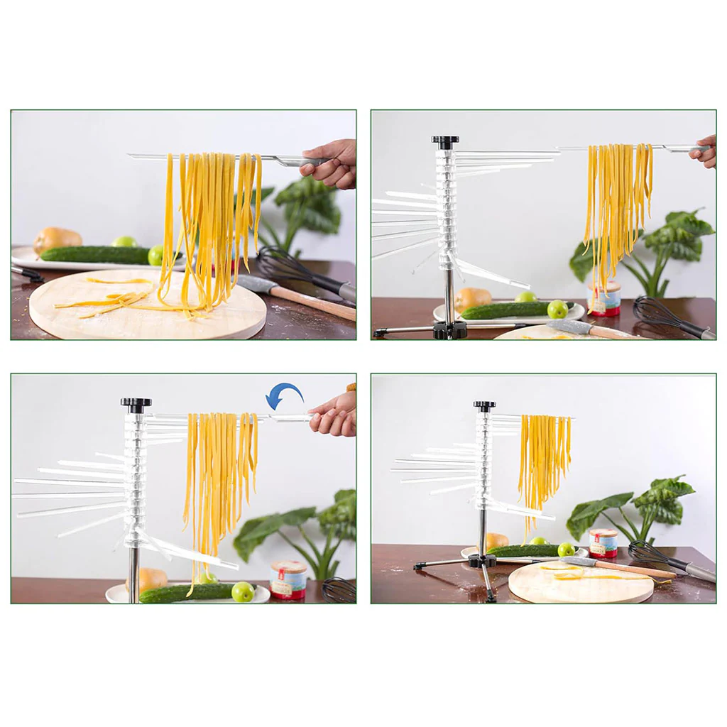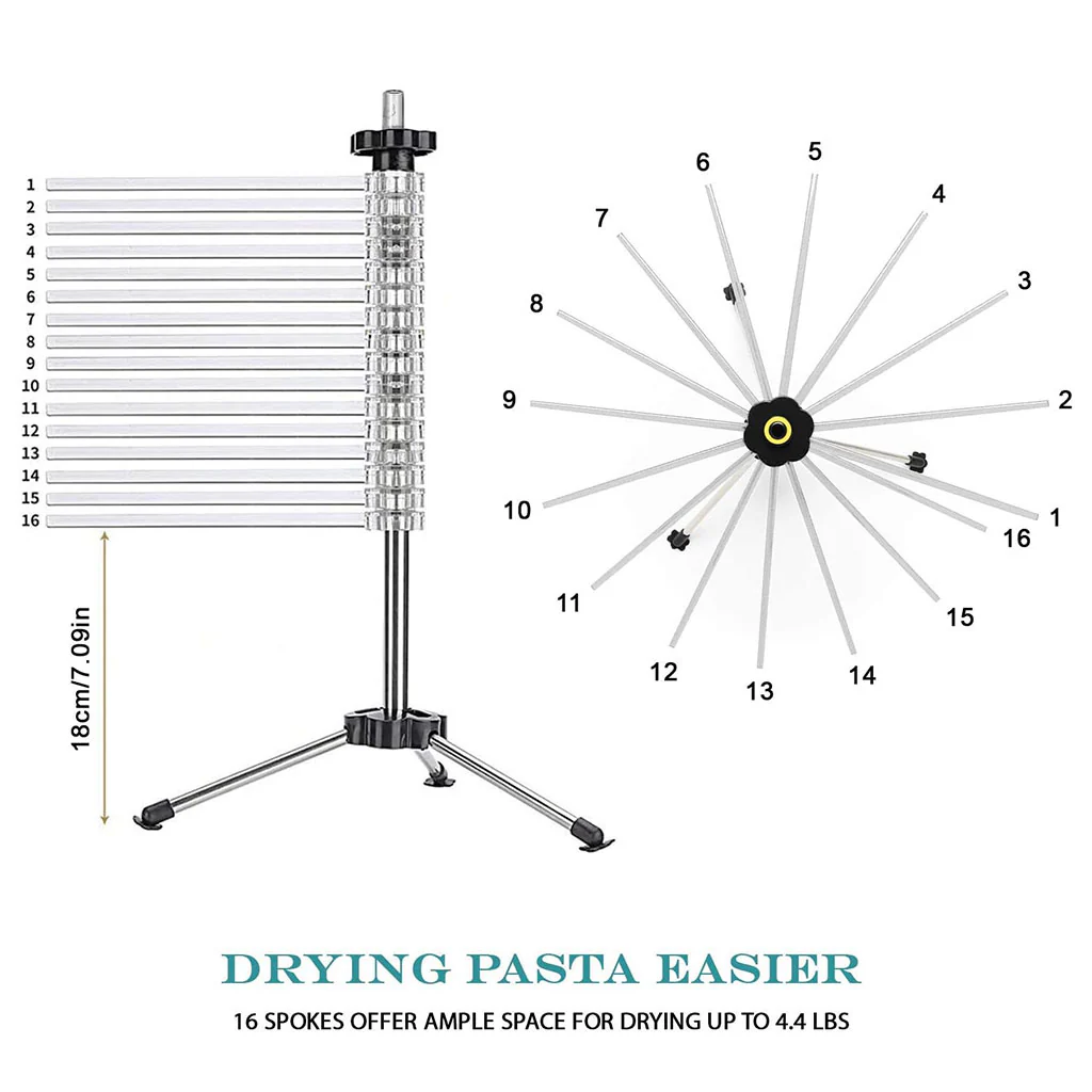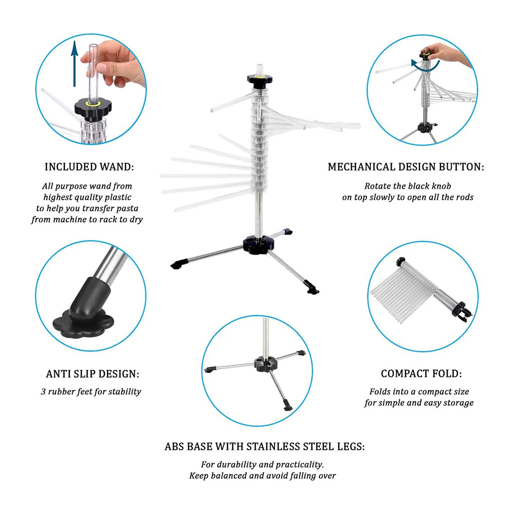 Cada brazo mide 20 cm, por lo que tendrás más de 3 metros de longitud total para secar la pasta en un espacio muy reducido. En la columna central hay una varita extraíble de plástico ABS que es perfecta para ayudarte a recoger la pasta que hayas cortado y colocarla en los brazos del secador.