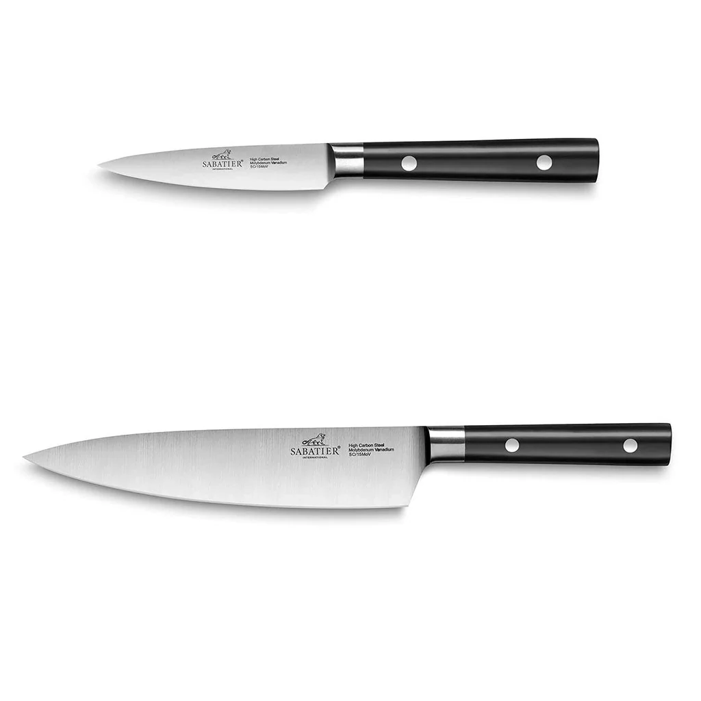 El Set de 2 cuchillos de cocina Leonys de Sabatier® es un conjunto de dos piezas imprescindibles en la preparación de tus recetas. El set incluye un cuchillo pelador de 9 cm y un cuchillo chef de 20 cm, los dos cuchillos más versátiles en la cocina. Dos herramientas de corte con las que podrás cortar, pelar, picar, rebanar y trocear todo tipo de alimentos. ¡Un regalo perfecto en cualquier cocina!