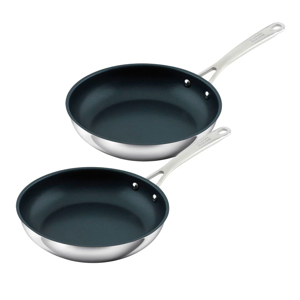 El Set 2 sartenes antiadherentes Allround de Kuhn Rikon es un práctico conjunto de dos sartenes, de 24 y 28 cm. Su exterior de acero inoxidable permite un rápido control y reparto de la temperatura y su revestimiento antiadherente reforzado con partículas de titanio, te permitirá cocinar con muy poco aceite y sin que se pegue nada.