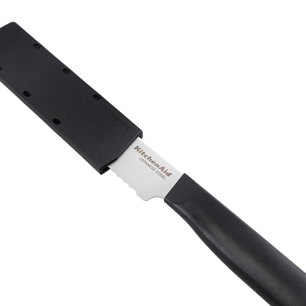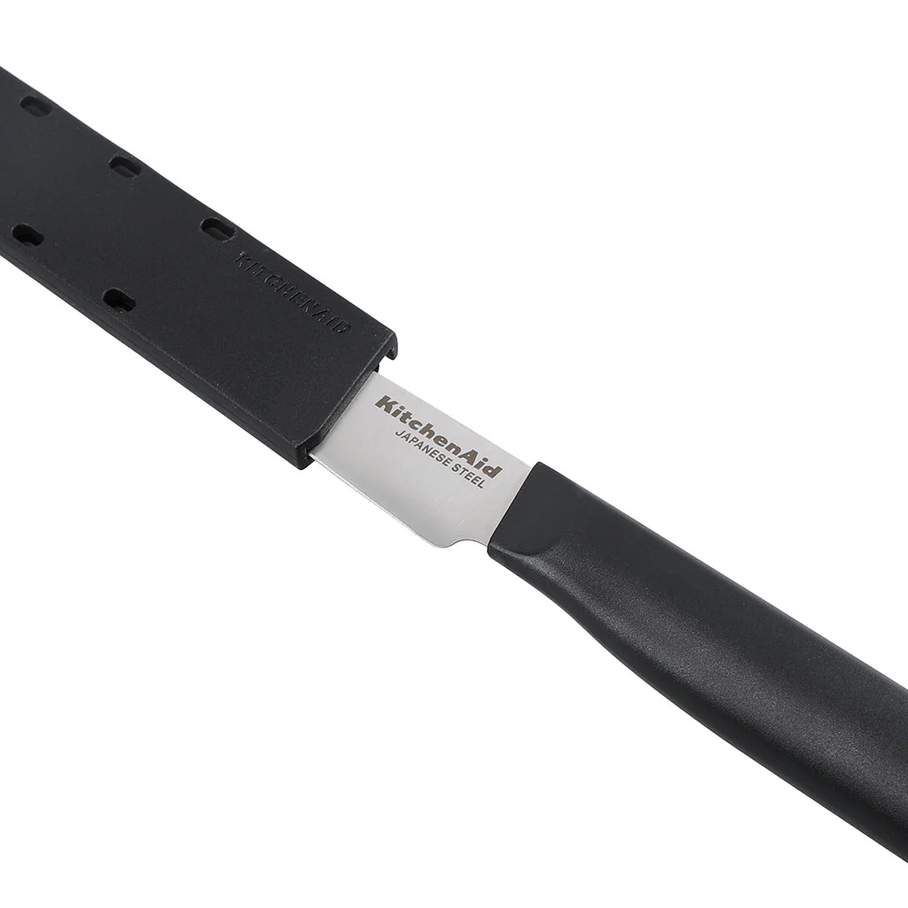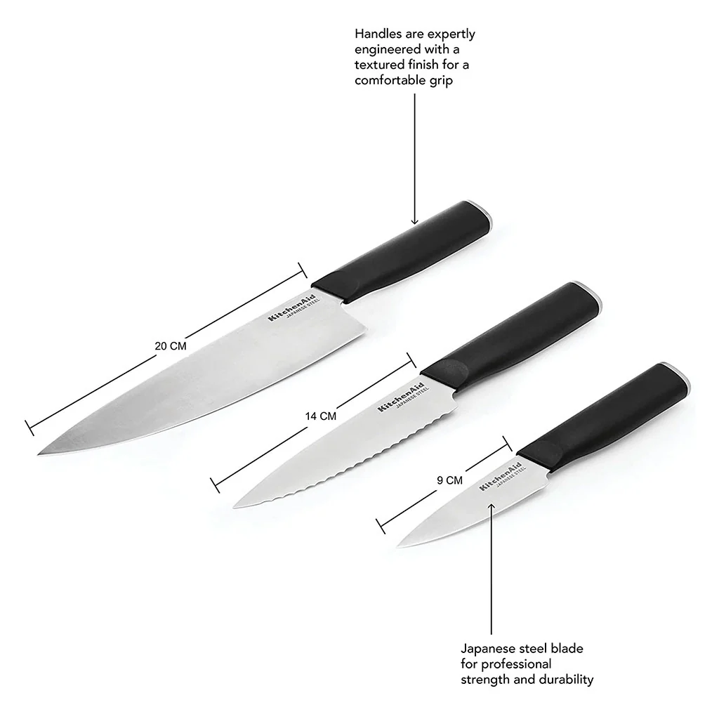 El Set de 3 cuchillos chef KitchenAid es un completo juego de tres cuchillos de cocina de acero japonés con cubierta protectora para las hojas. El conjunto incluye dos cuchillos de filo liso y uno de sierra, esenciales para preparar tus recetas y con los que podrás picar, pelar, rebanar o cortar con precisión y facilidad incluso los tomates.