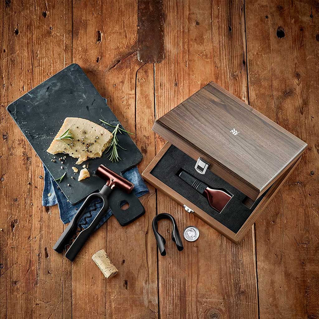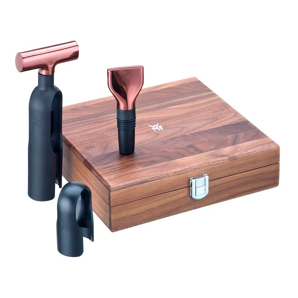 El Set de 3 piezas Sommelier Baric de WMF es un conjunto de tres utensilios, con el que tendrás todo lo necesario para disfrutar de tus mejores vinos. Se presenta en una elegante caja de madera de nogal e incluye un sacacorchos, un cortador de cápsulas y un tapón a juego. Fabricado en acero inoxidable con acabados en color cobre, es un regalo ideal para los amantes del vino.