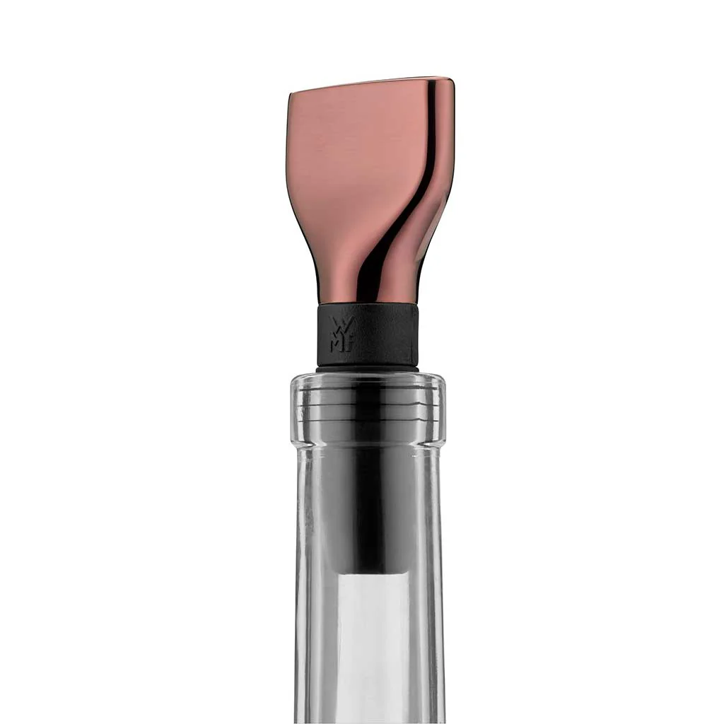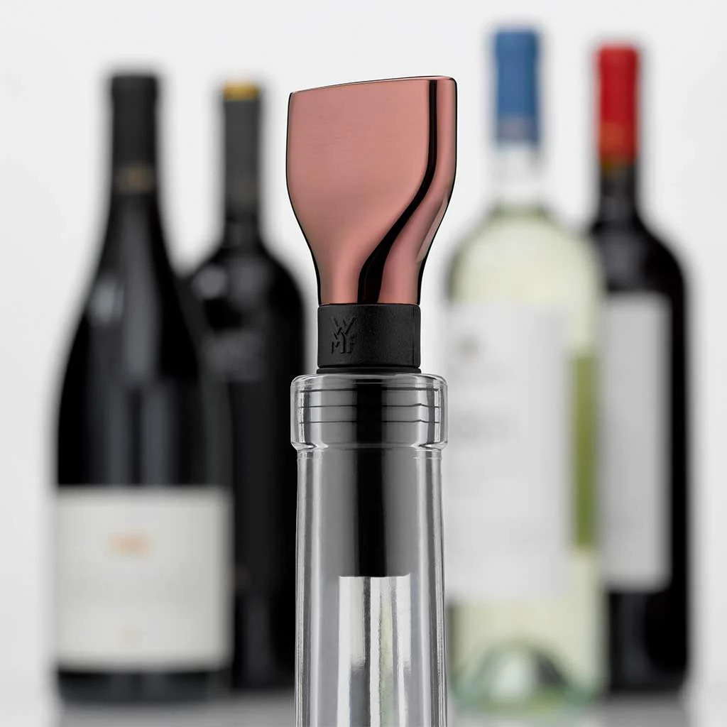 - El tapón, de resina y acero inoxidable Cromargan®18/10 con acabados en color cobre. Tan elegante como práctico, mantiene los aromas del vino intactos en el interior de la botella gracias a su efecto de cierre hermético.