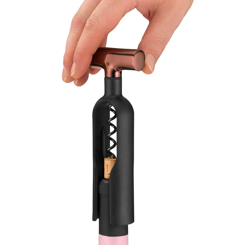 - El sacacorchos de espiral reforzado, de acero inoxidable Cromargan®18/10 con acabados en color cobre. Sus brazos de resina negra se adaptan a los cuellos de todas las botellas de vino. La eficiente tecnología de rotación, te permitirá sacar el tapón, de corcho o sintético, descorchando fácilmente y sin esfuerzo. Y una vez fuera, girando el cabezal en sentido opuesto a las agujas del reloj, desenroscarás el corcho.