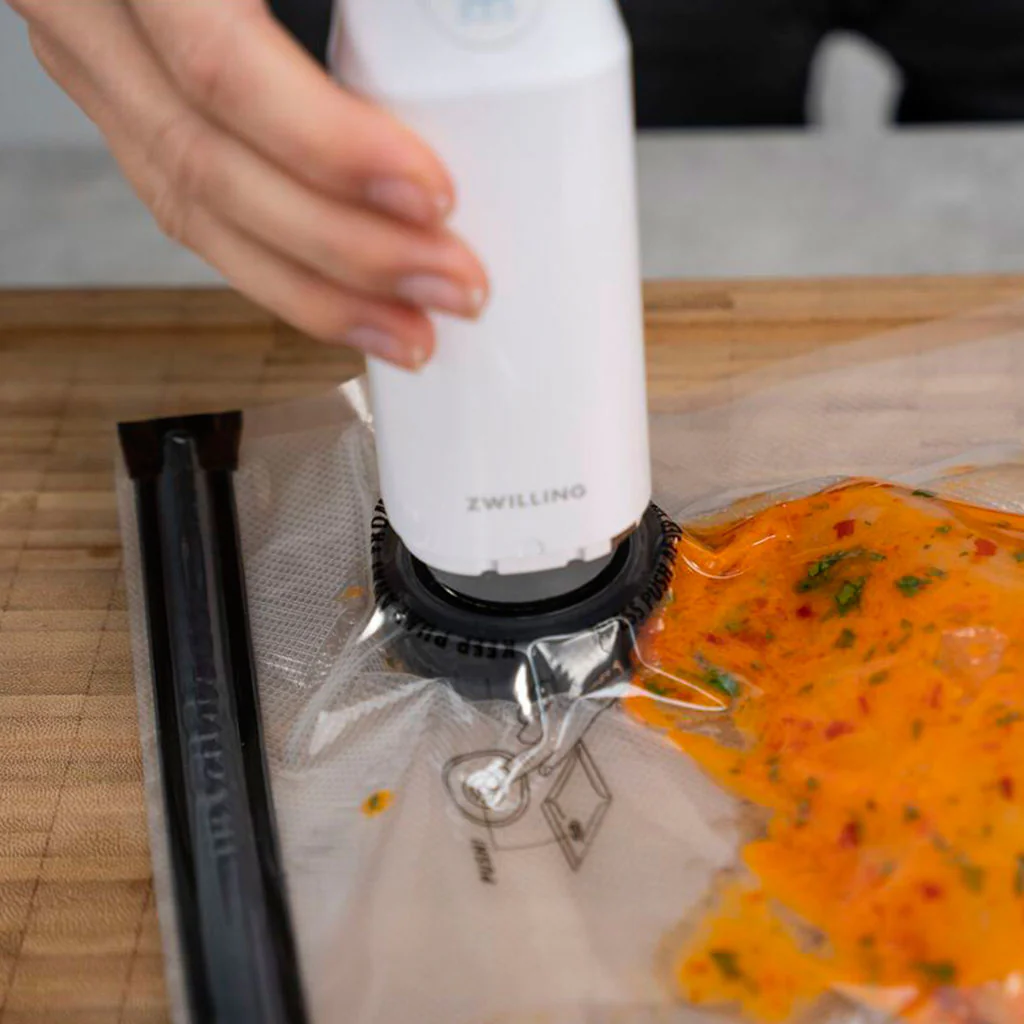 - Es imprescindible para envasar y cocinar sous-vide alimentos con líquidos, marinados o en salsa.
