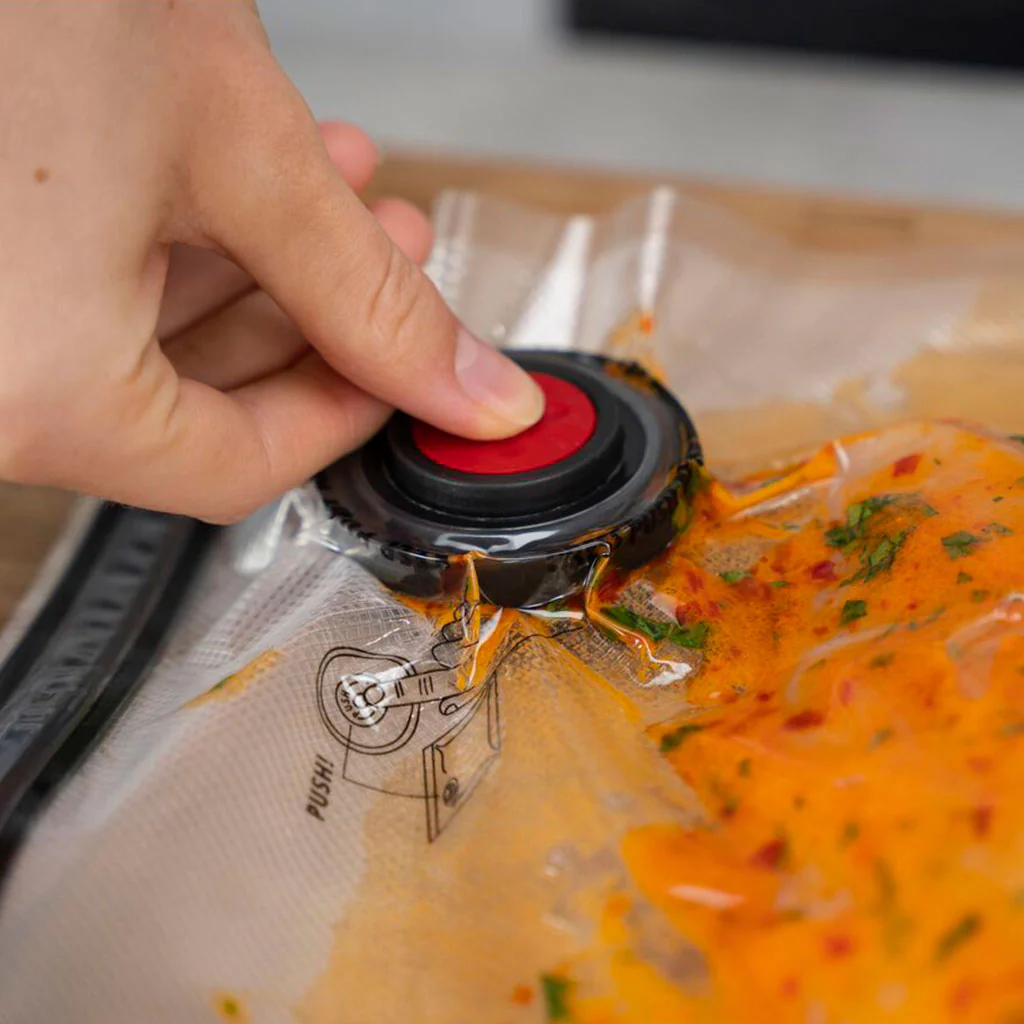 Este set es perfecto para tus marinados, o cuando requieres hacer el vacío en alimentos envasados con salsa o distintos adobos. Esta pequeña boquilla actúa de barrera y te garantiza que la bomba no absorberá los líquidos tan rápidamente, permaneciendo en la bolsa. Al frenar la absorción, ayuda a proteger la bomba, evitando los daños causados por los líquidos.