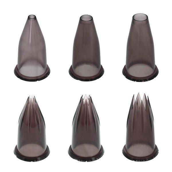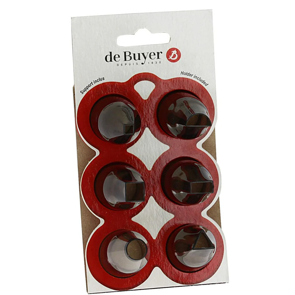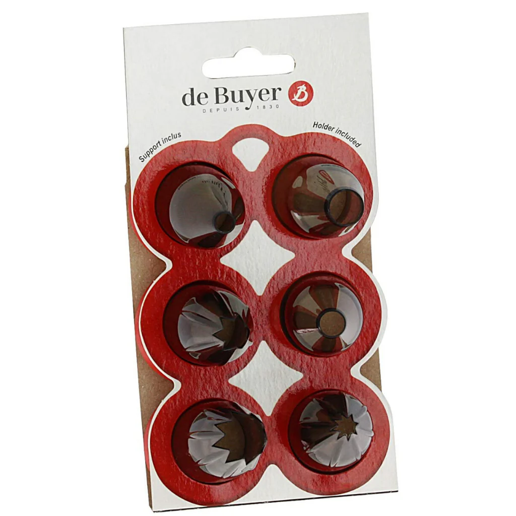 Set de 6 boquillas para manga pastelera De Buyer, ideal para decorar dulces y todo tipo de repostería. Están fabricadas en plástico resistente, totalmente libre de BPA en color negro translúcido.