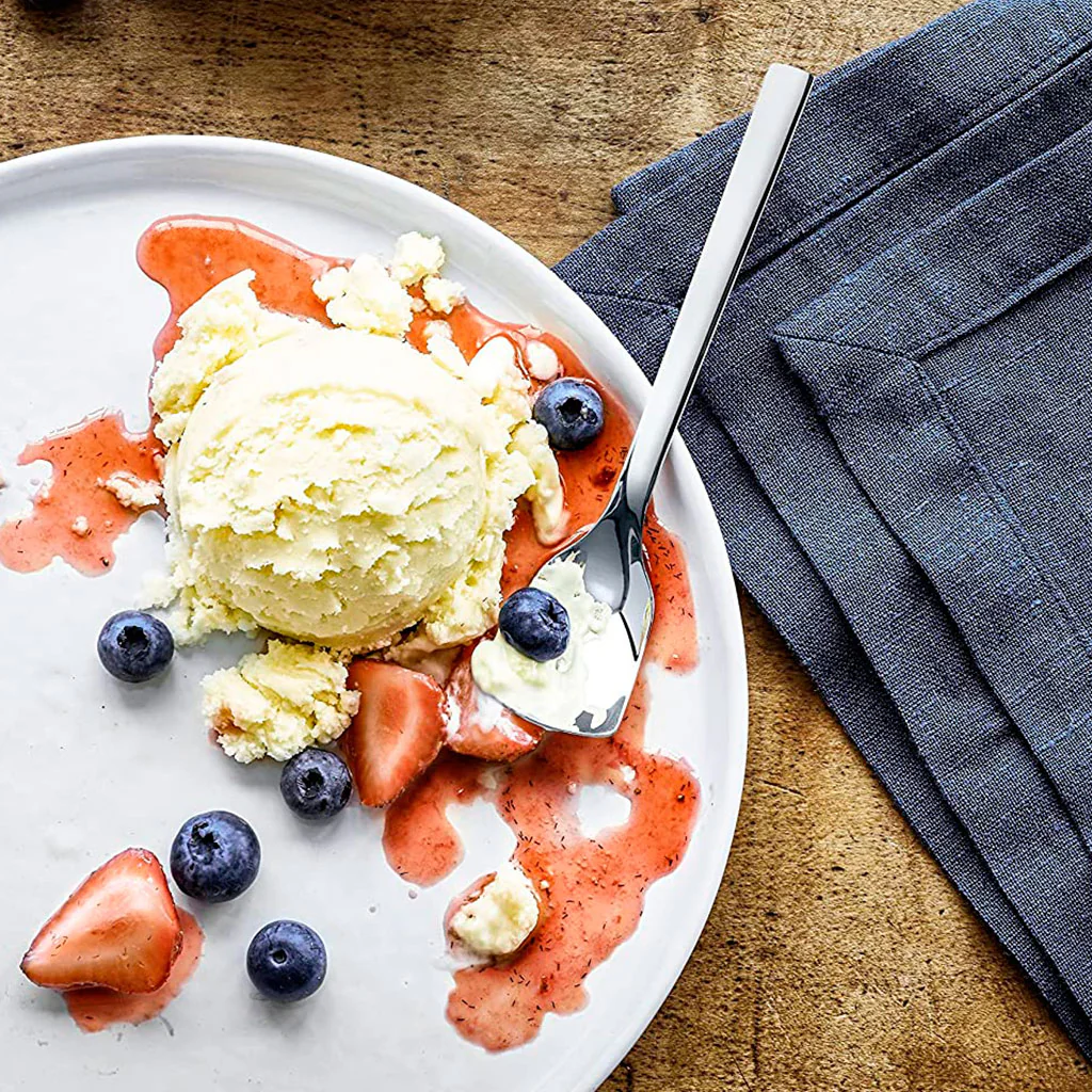 Las cucharas para helado miden 14 cm de largo y son de acero inoxidable 18/10 Cromargan®, que les confiere una gran resistencia, incluso a los alimentos ácidos, y durabilidad, así como un acabado muy bonito. Son aptas para el lavavajillas.