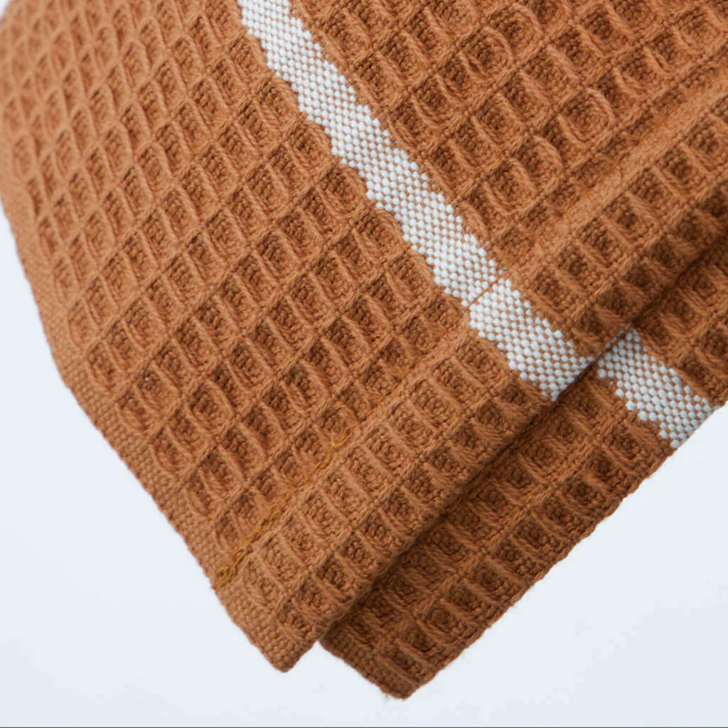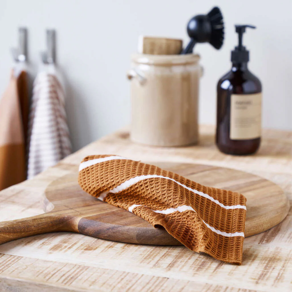 Cada paño del set cuenta con un tejido de gofre muy bonito y una gran capacidad de absorción. Su diseño, con rayas blancas sobre un cálido fondo color arena, añade un toque rústico y natural a cualquier cocina.